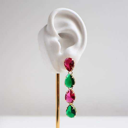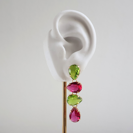 Brinco Dourado e Cristal Verde e Rosa - Semijoia
