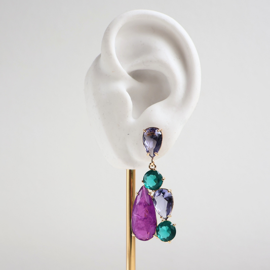 Brinco Dourado e Cristal Verde e Roxo - Semijoia