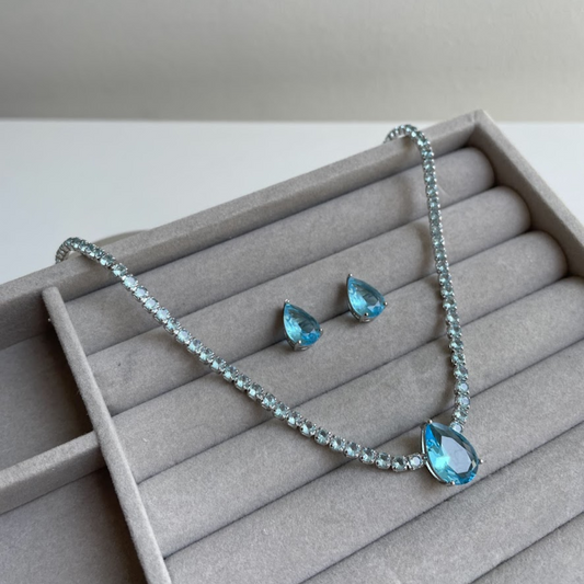 Kit Brinco e Colar - Prateado e Cristal Azul Turquesa - Semijoia