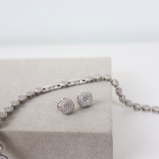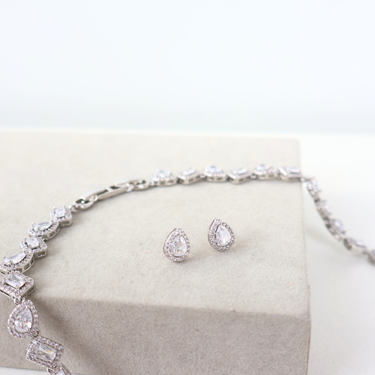 Kit Brinco e Colar - Prateado e Cristal Translúcido - Semijoia