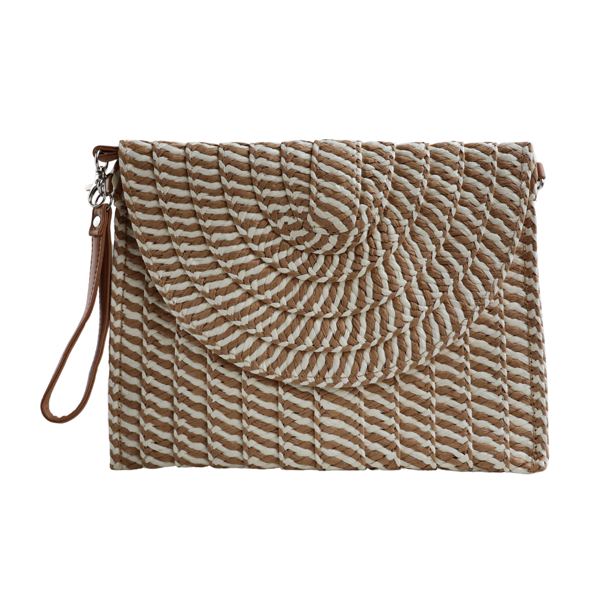 Bolsa Carteira Envelope de Palha de formato retangular, bordas quadradas, textura macia, fecho de ímã, interior forrado. Traz alça transversal removível.
