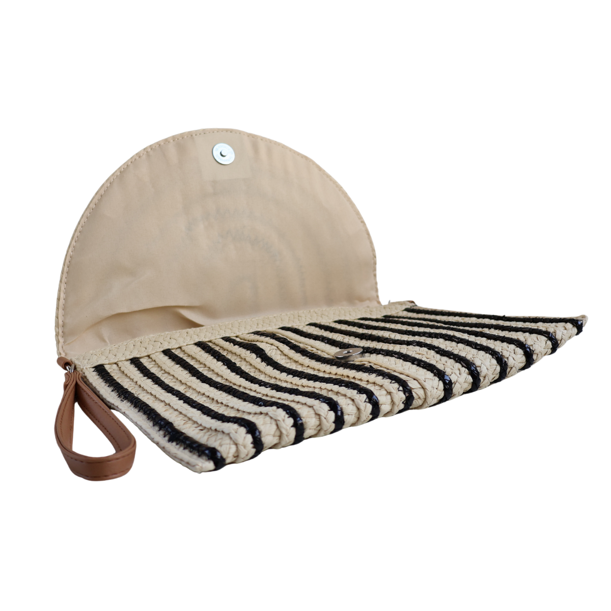 Bolsa Carteira Envelope de Palha de formato retangular, bordas quadradas, textura macia, fecho de ímã, interior forrado. Traz alça transversal removível.