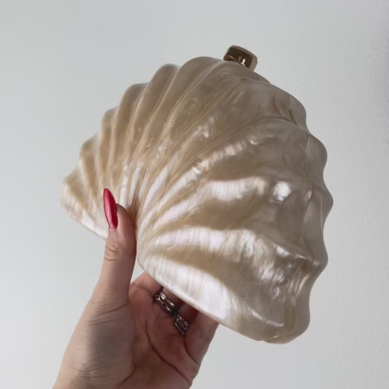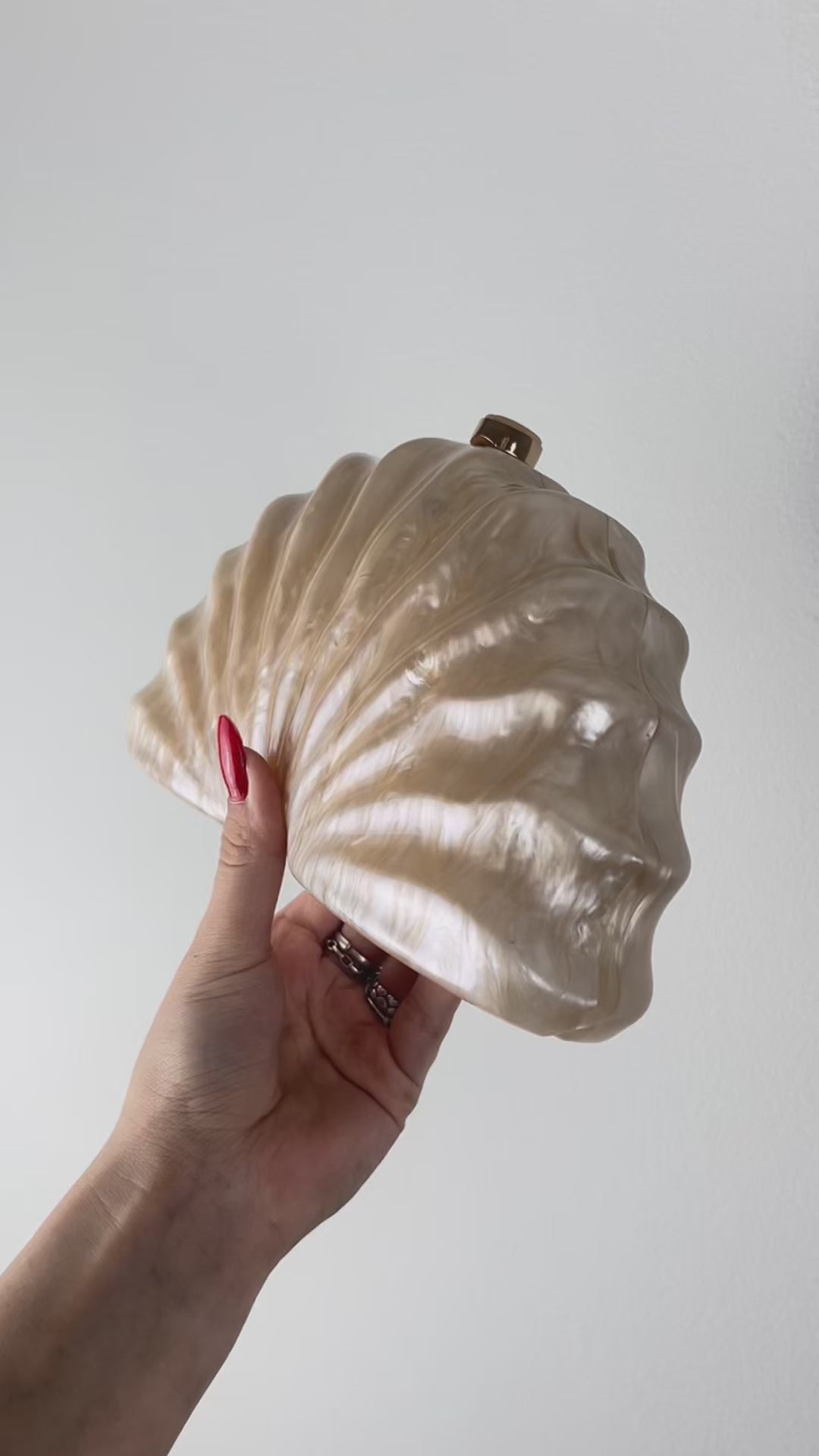 Bolsa de festa clutch de formato meia lua, bordas arredondadas, em acrílico rígido, acabamento liso, fecho de encaixe, interior forrado. Traz alça transversal removível.