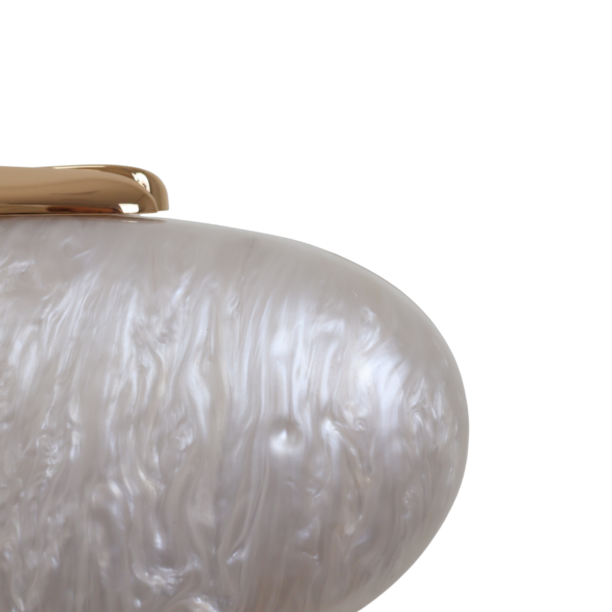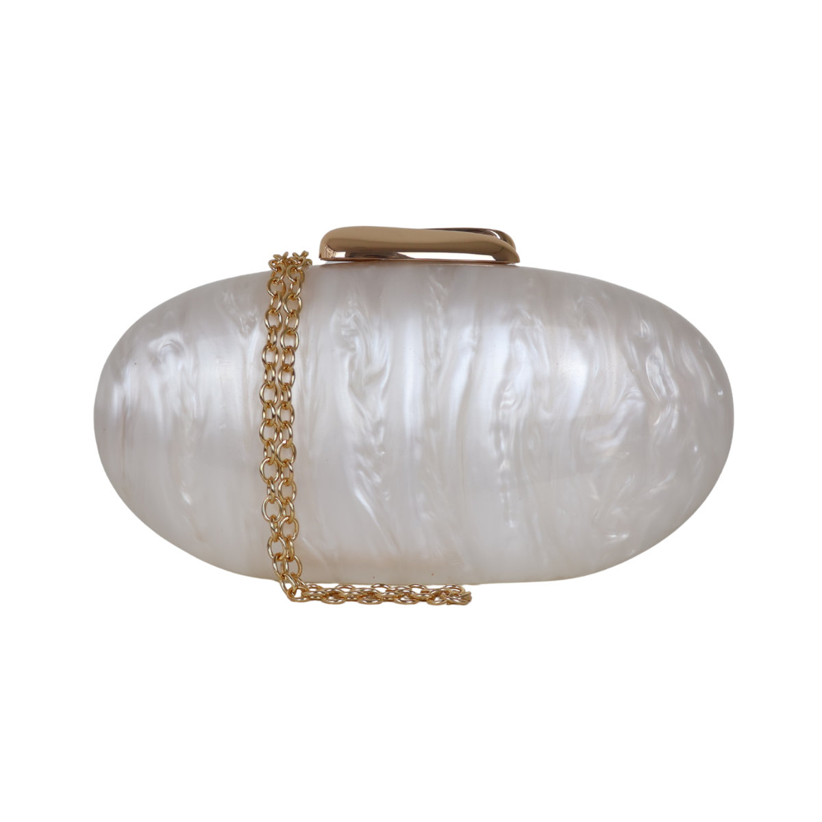 Bolsa de festa clutch de formato oval, bordas arredondadas, em acrílico rígido, acabamento liso, fecho magnético, interior forrado. Traz alça transversal removível.
