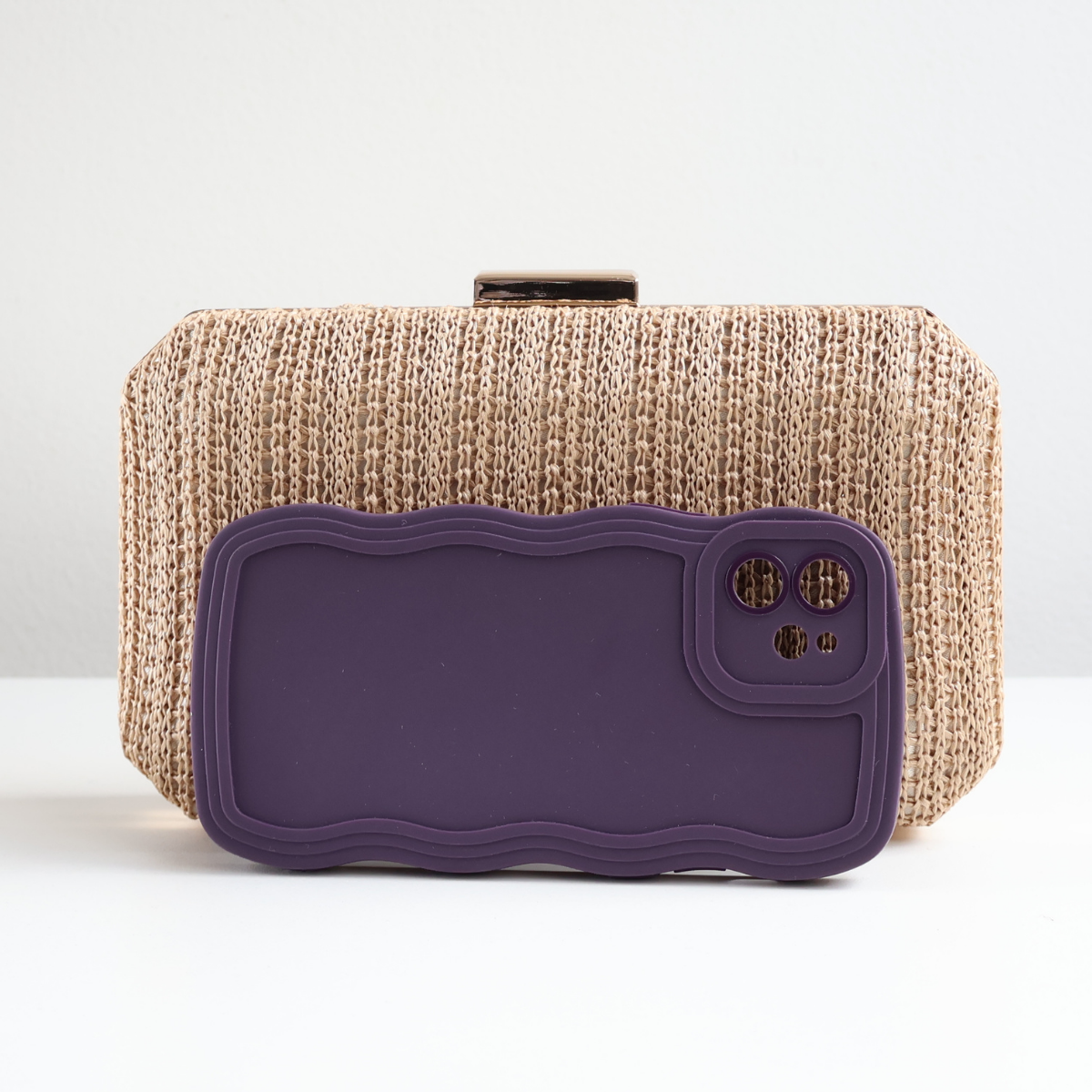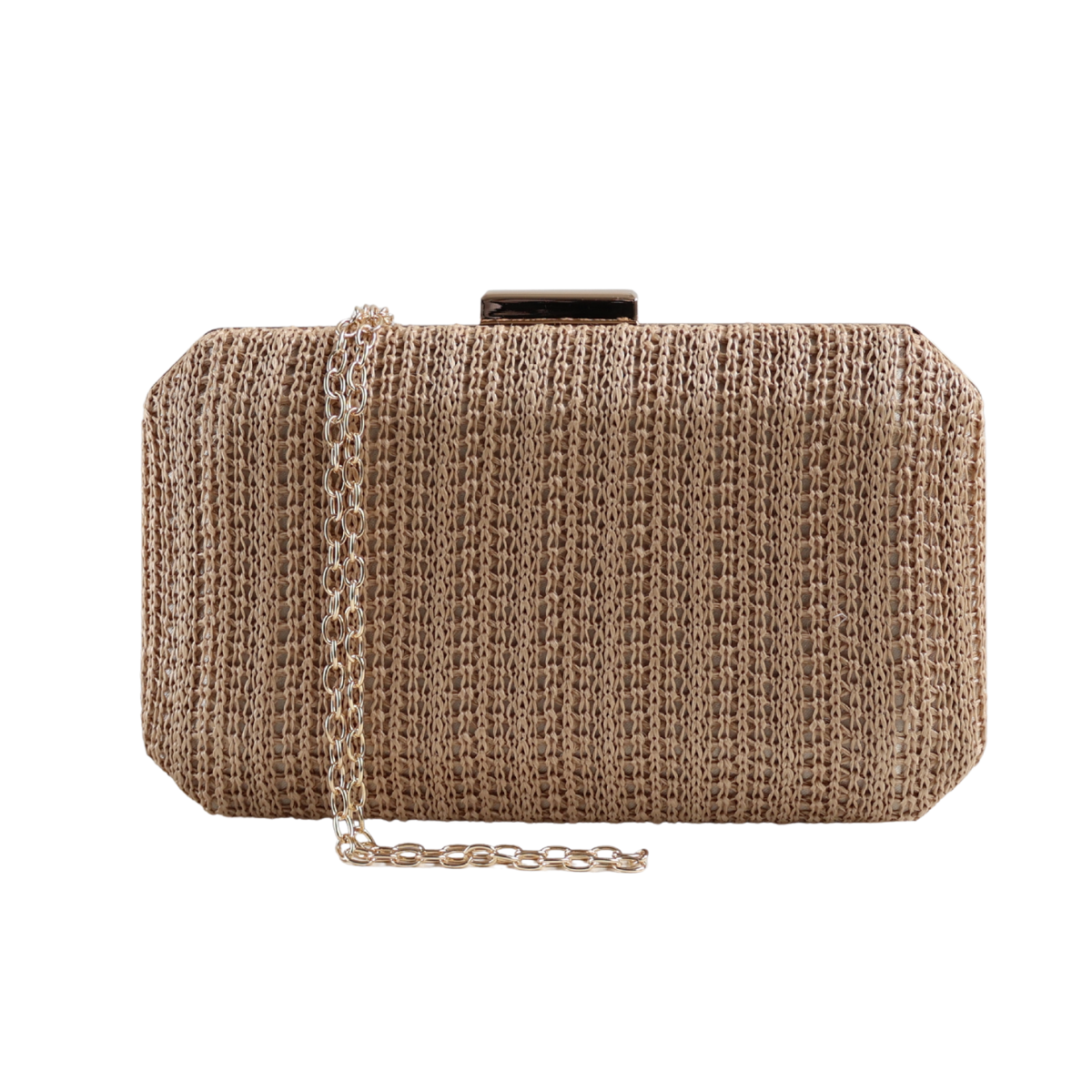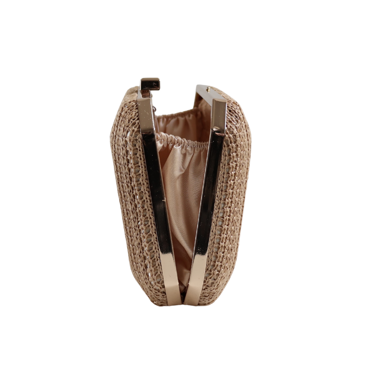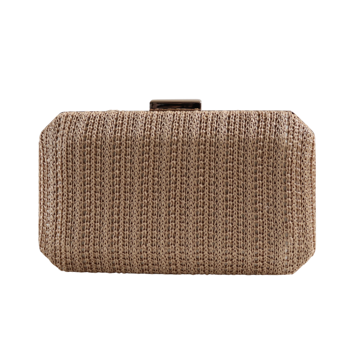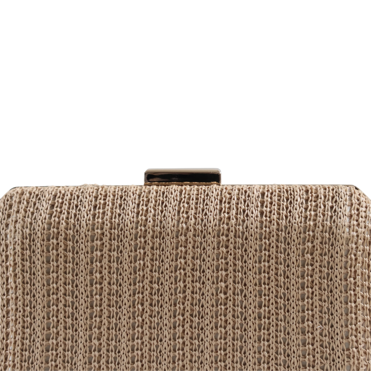 Bolsa de festa clutch de formato retangular, bordas arredondadas, acabamento em palha sintética, fecho de ímã, interior forrado. Traz alça transversal removível.