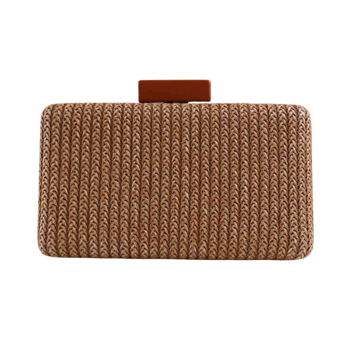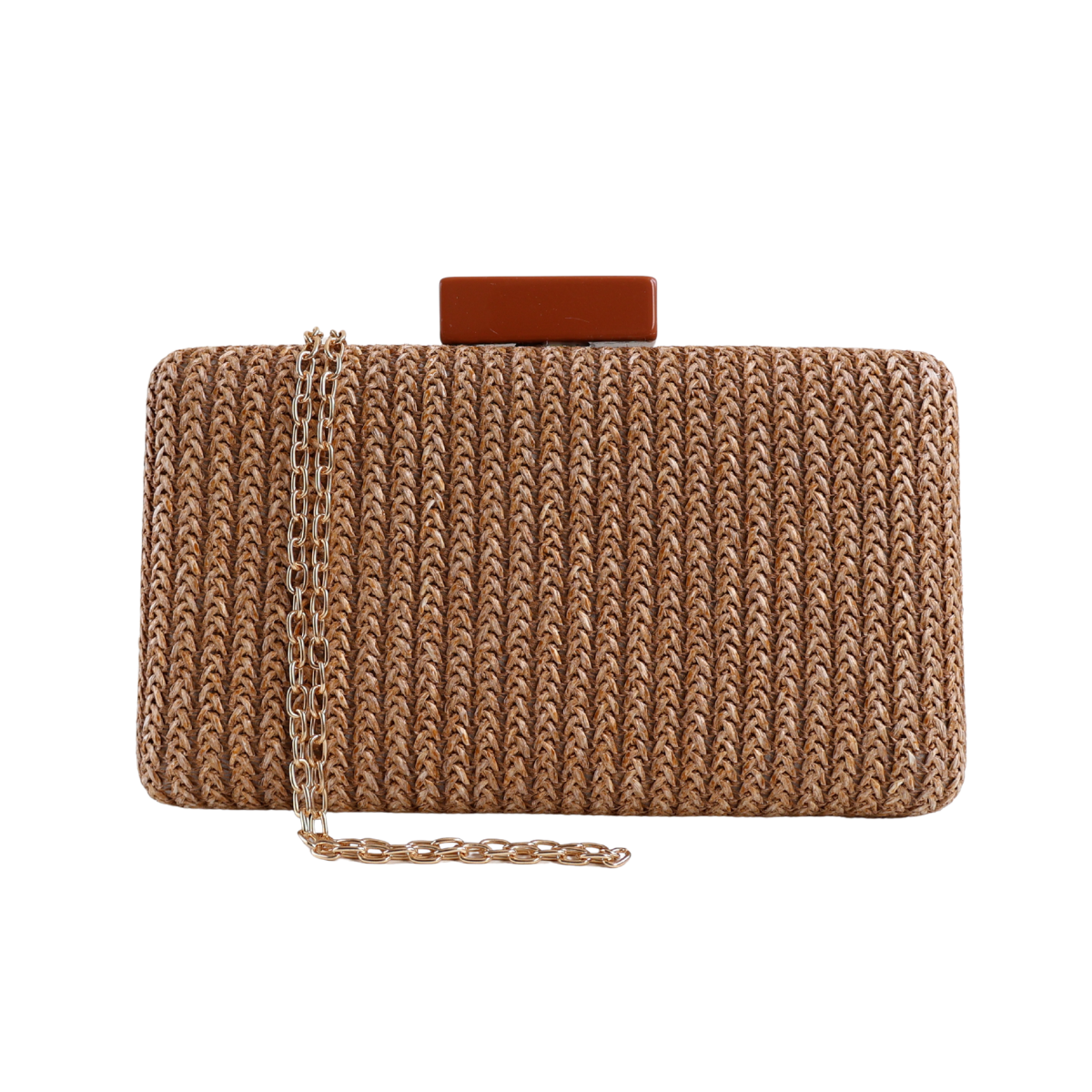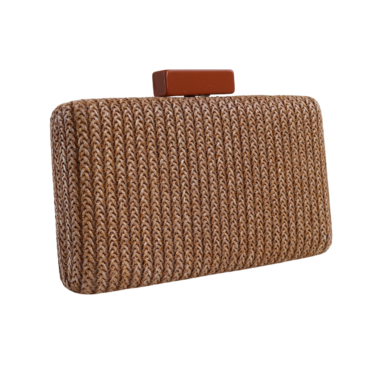 Bolsa de festa clutch de formato retangular, bordas arredondadas, acabamento em palha sintética, fecho de ímã, interior forrado. Traz alça transversal removível.