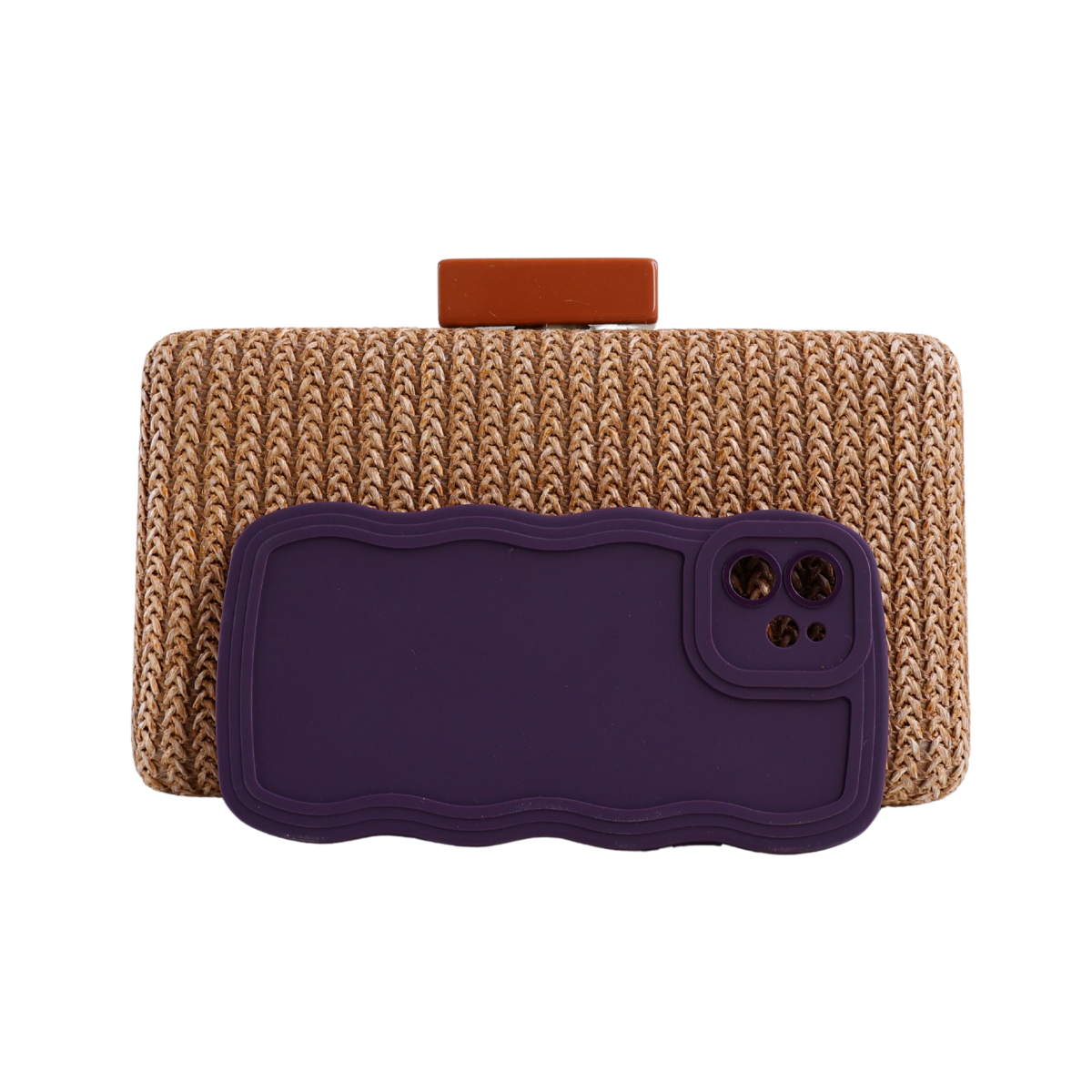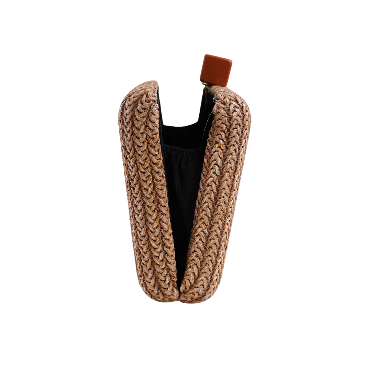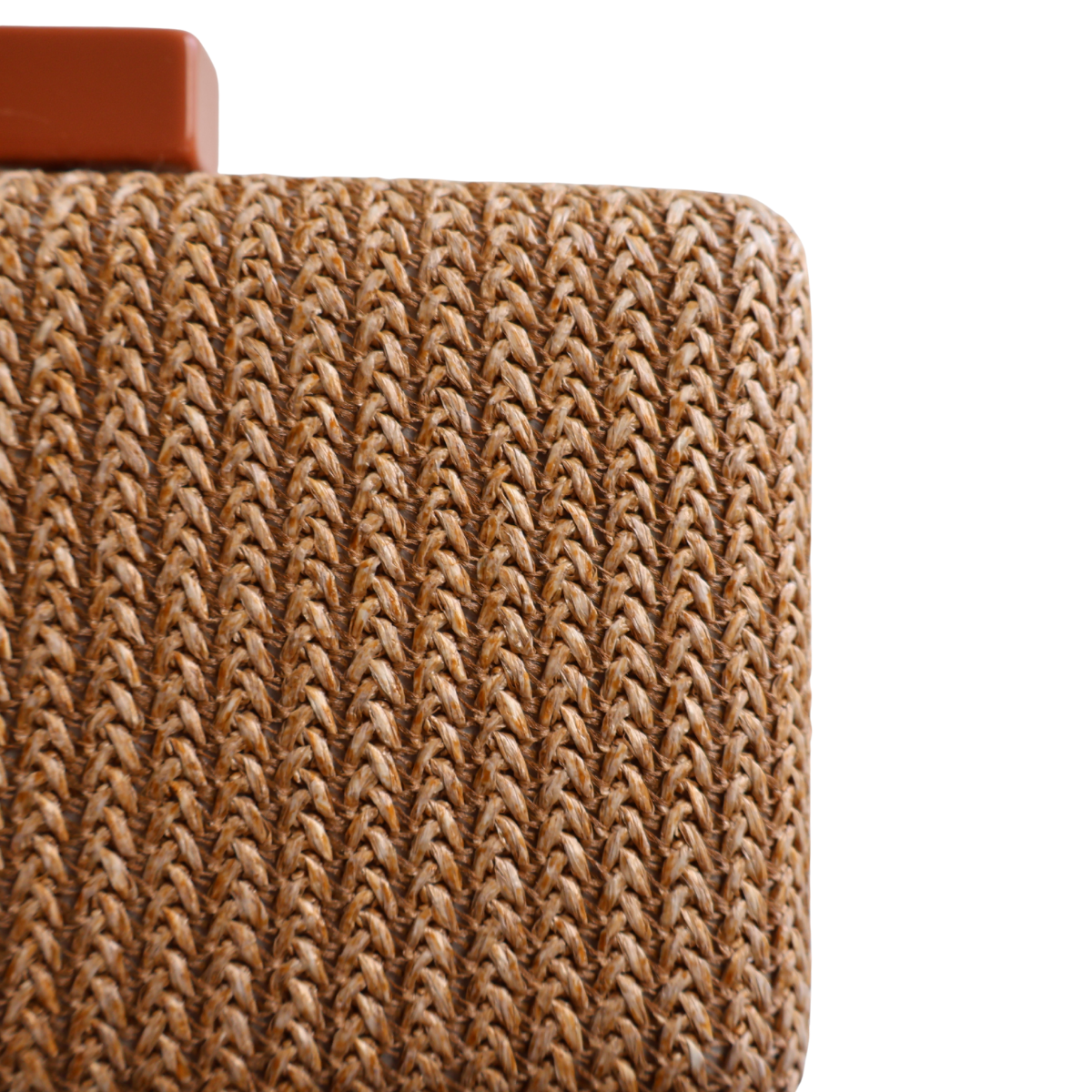 Bolsa de festa clutch de formato retangular, bordas arredondadas, acabamento em palha sintética, fecho de ímã, interior forrado. Traz alça transversal removível.