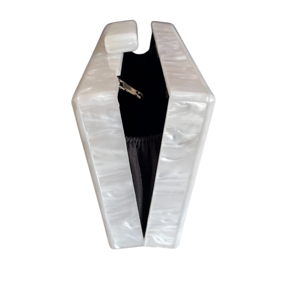 Bolsa de festa clutch de formato retangular, bordas quadradas, em acrílico rígido, acabamento liso, fecho de encaixe, interior forrado. Traz alça transversal removível.