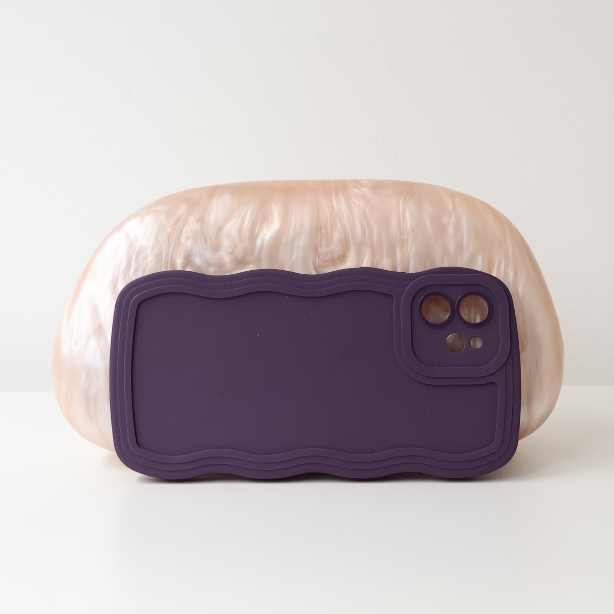 Bolsa de festa clutch perolada, formato retangular, bordas arredondadas, em acrílico rígido, acabamento liso, fecho de encaixe, interior forrado. Traz alça transversal removível.