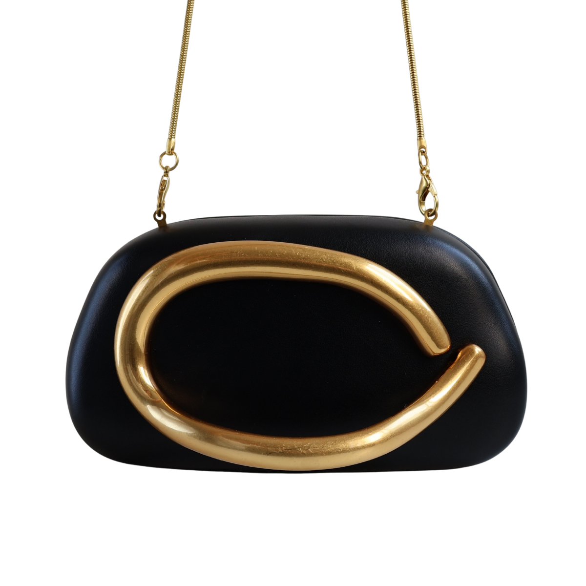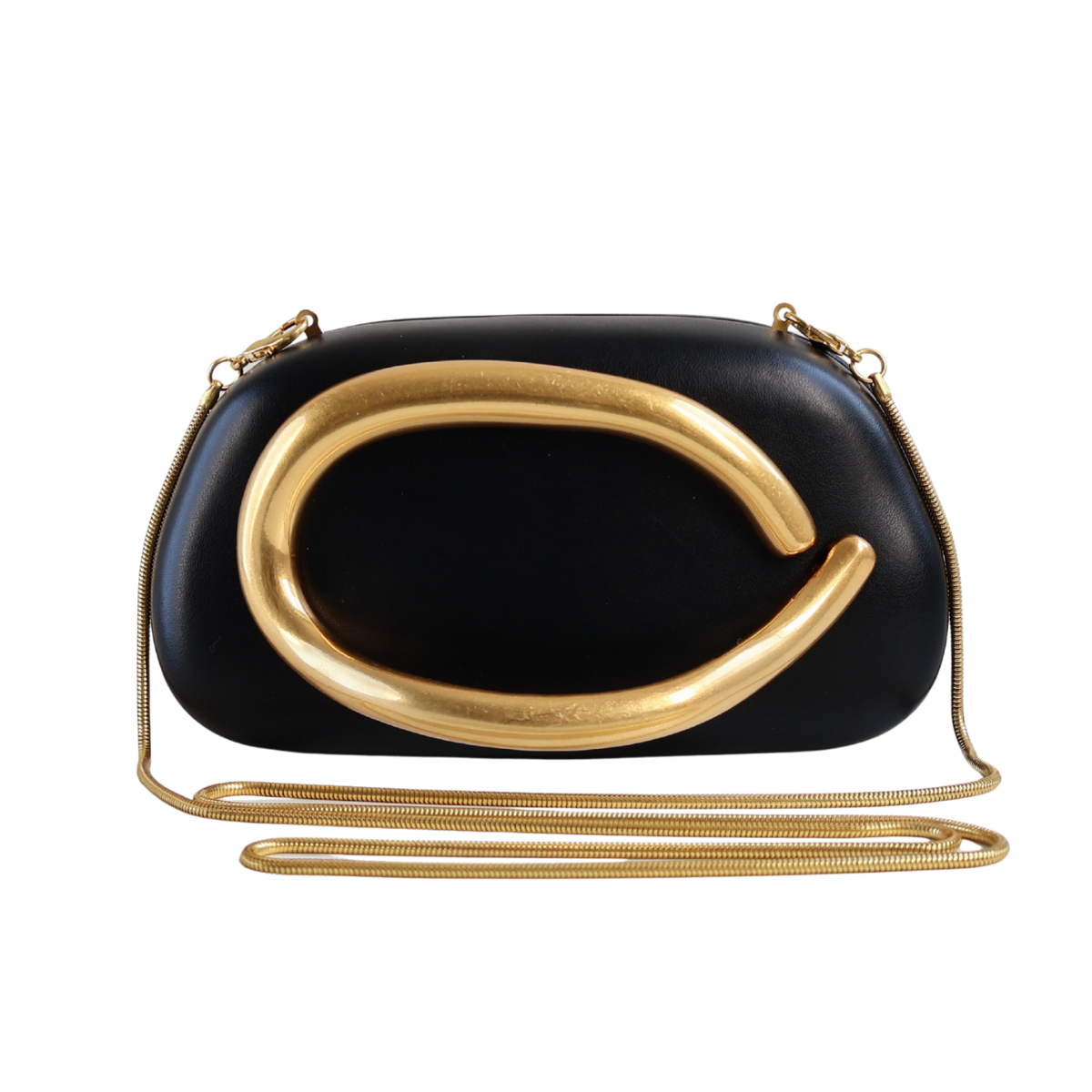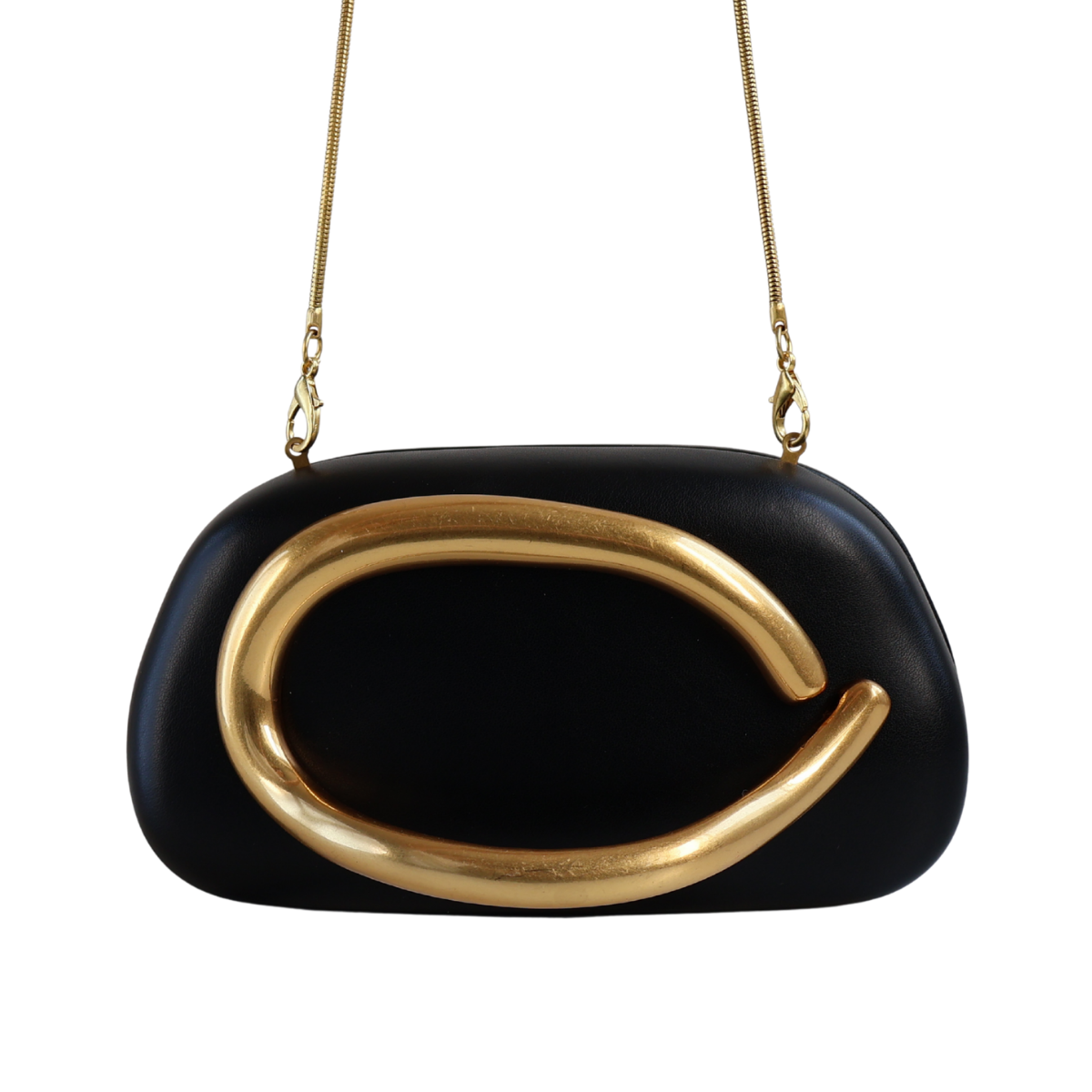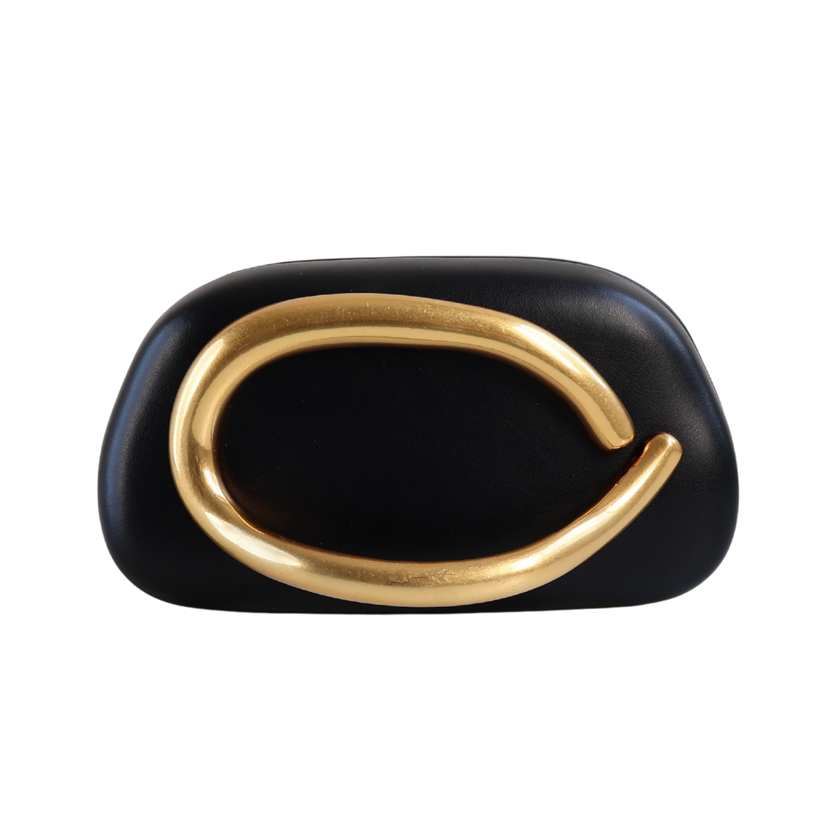 Bolsa de festa clutch de formato oval, bordas arredondadas, acabamento rígido, fecho magnético, interior forrado. Traz alça transversal removível.