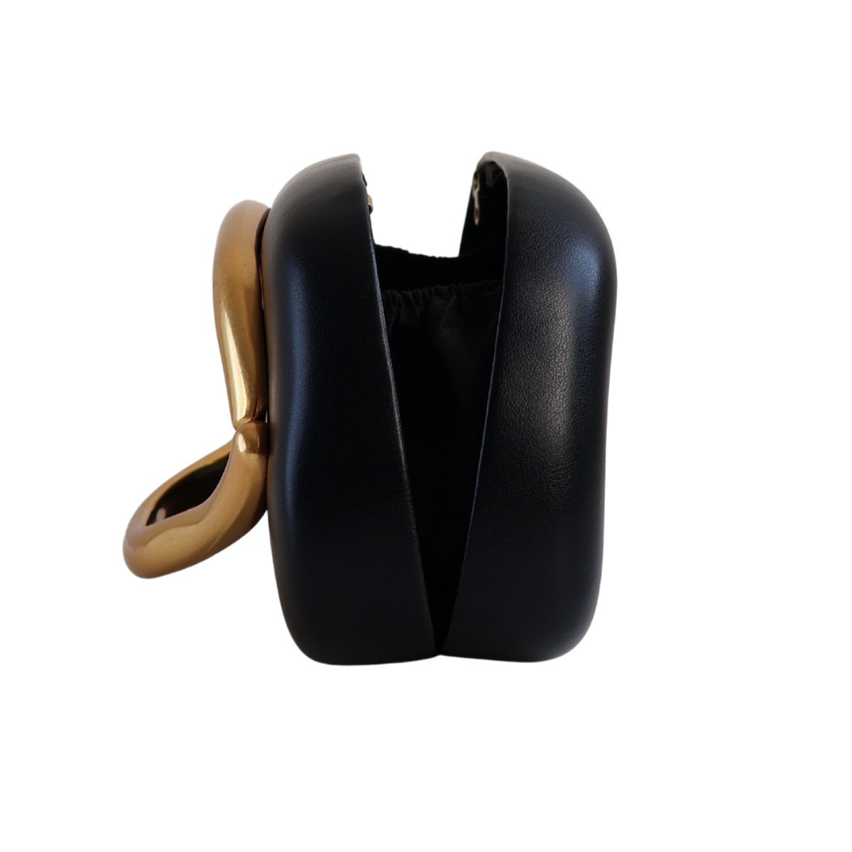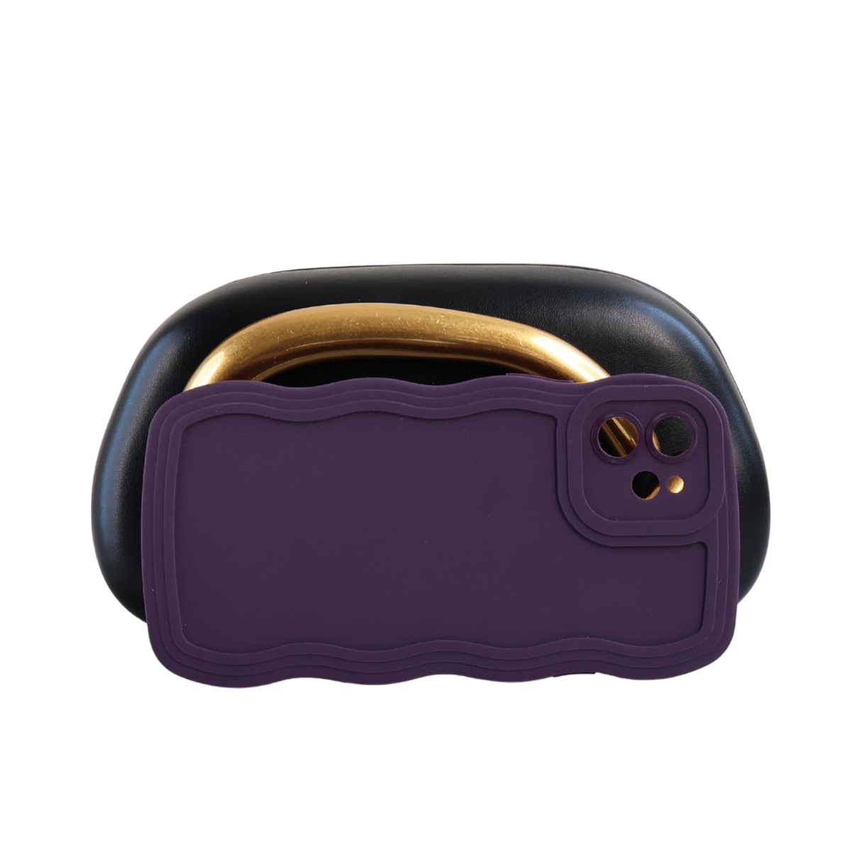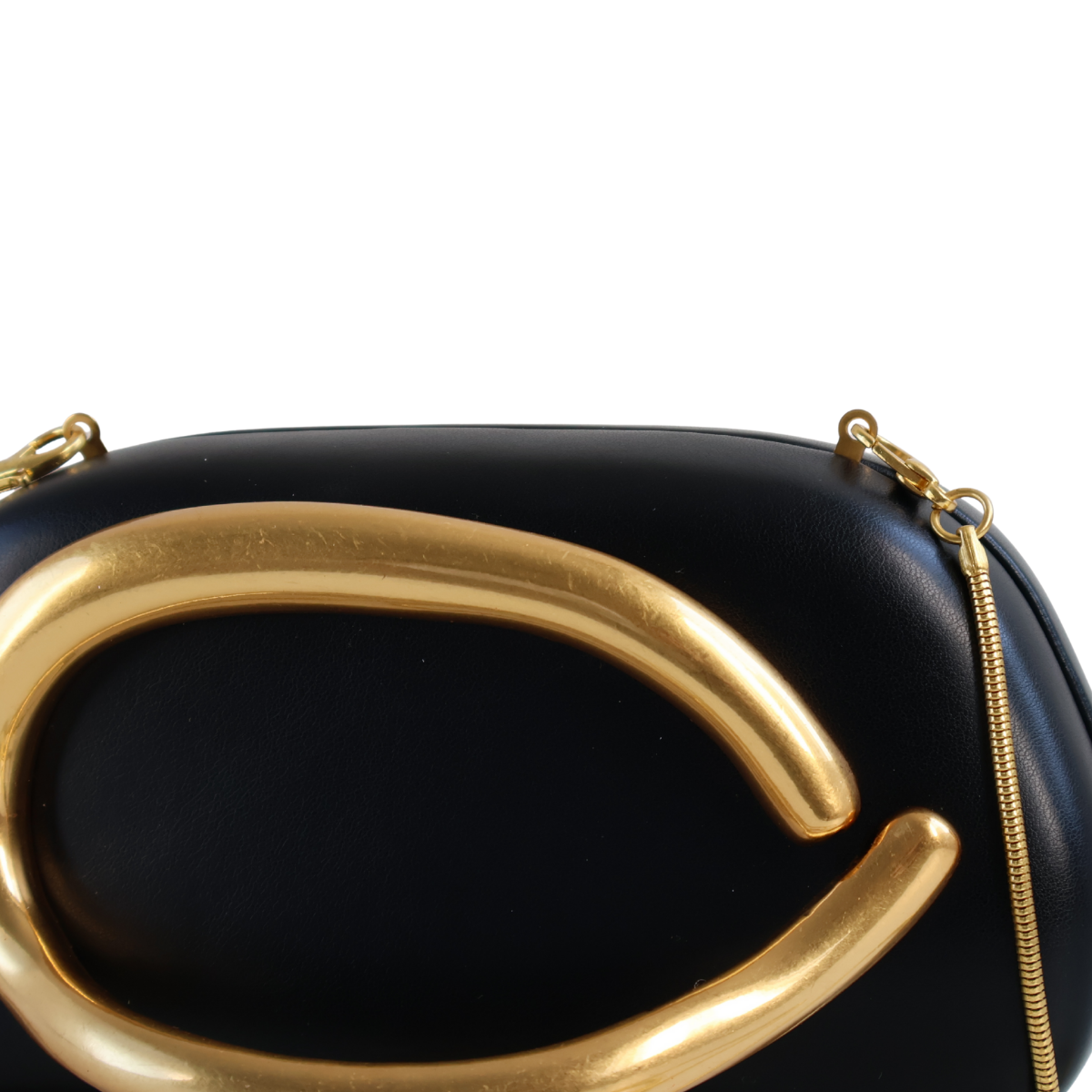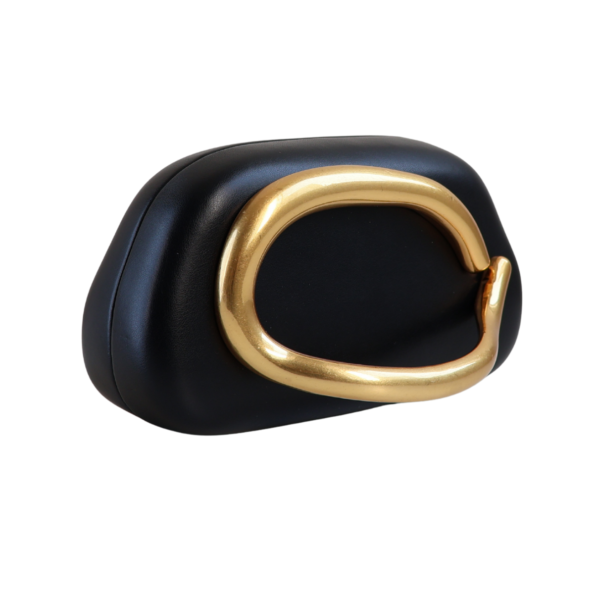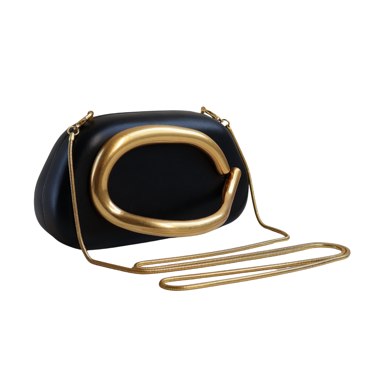 Bolsa de festa clutch de formato oval, bordas arredondadas, acabamento rígido, fecho magnético, interior forrado. Traz alça transversal removível.