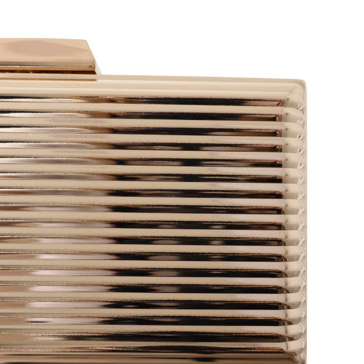 Bolsa de festa clutch de formato retangular, bordas quadradas, acabamento rígido, fecho de encaixe, interior forrado. Traz alça transversal removível.