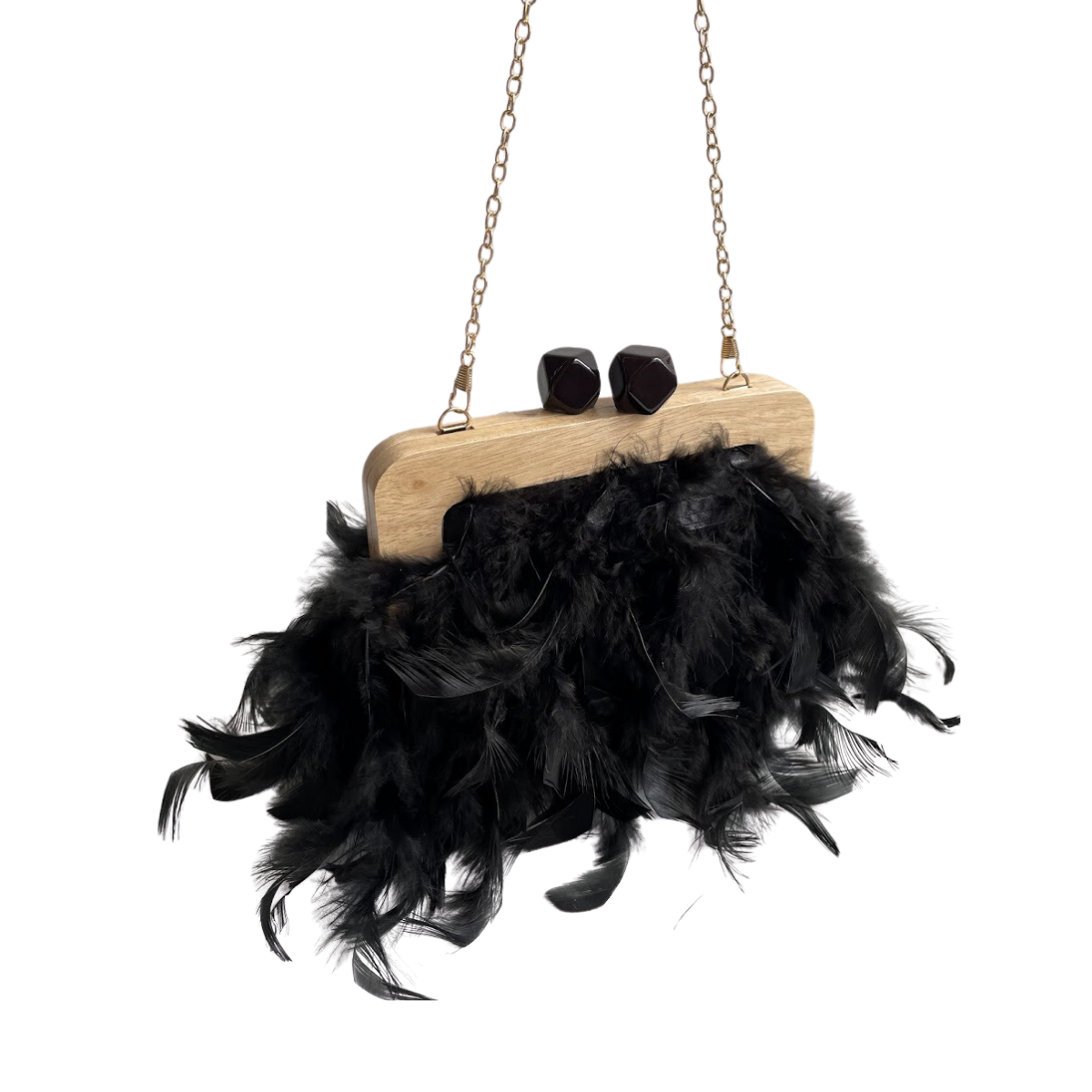Bolsa de Festa Clutch Madeira e Plumas Sintéticas Preta