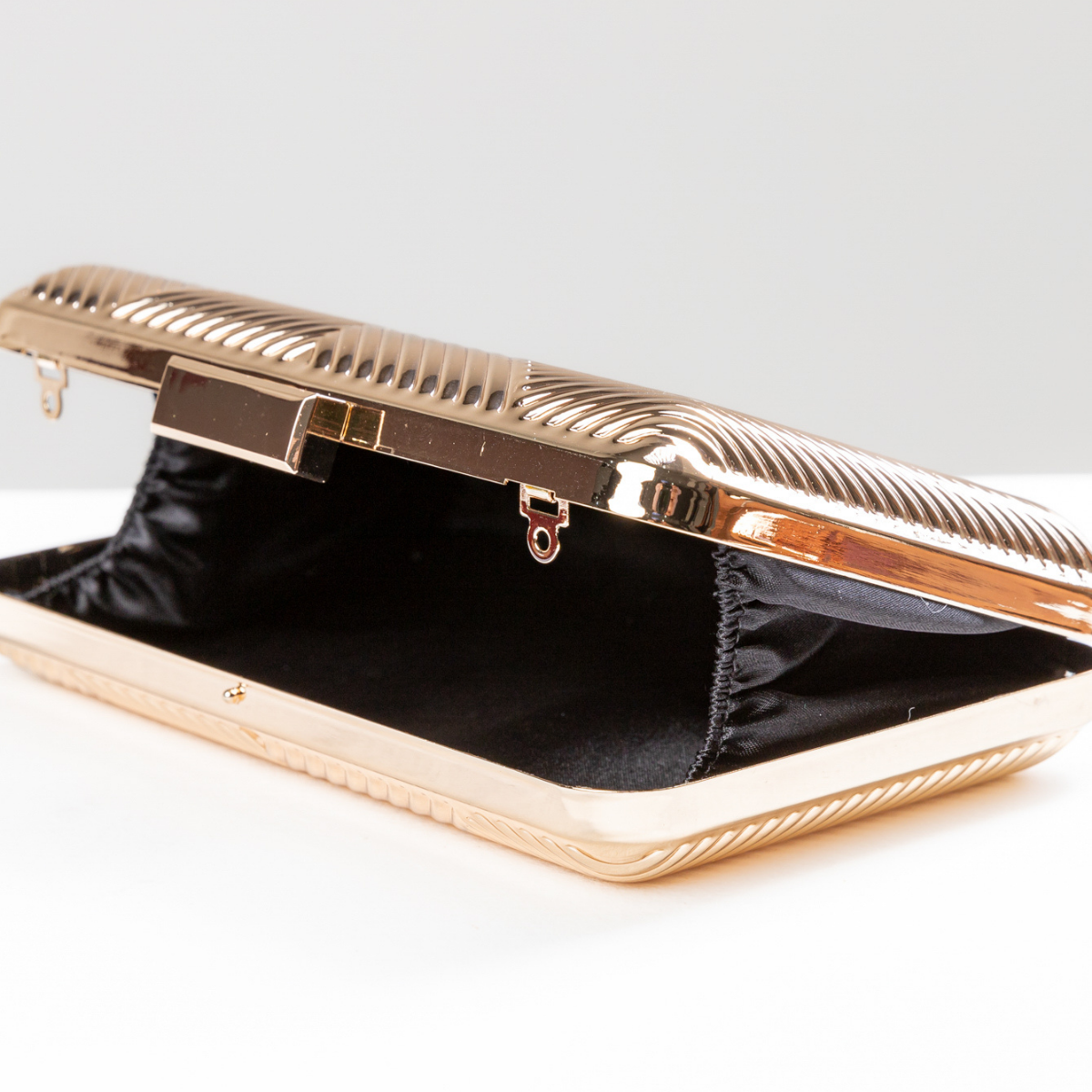 Bolsa de festa clutch de formato retangular, bordas quadradas, acabamento rígido, fecho de encaixe, interior forrado. Traz alça transversal removível.