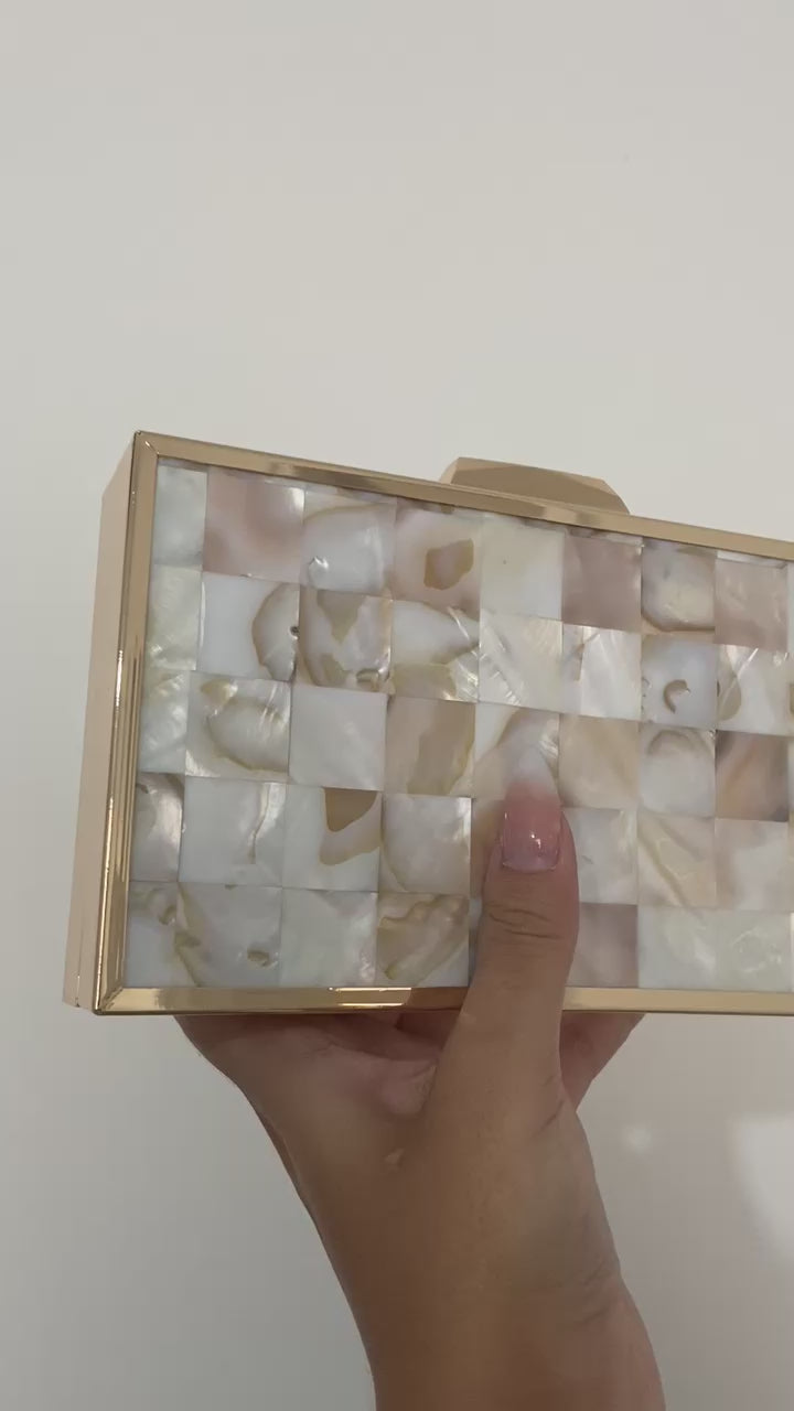 Bolsa de festa clutch de formato retangular, bordas quadradas, em material rígido, acabamento em madrepérola, fecho de encaixe, interior forrado. Traz alça transversal removível.