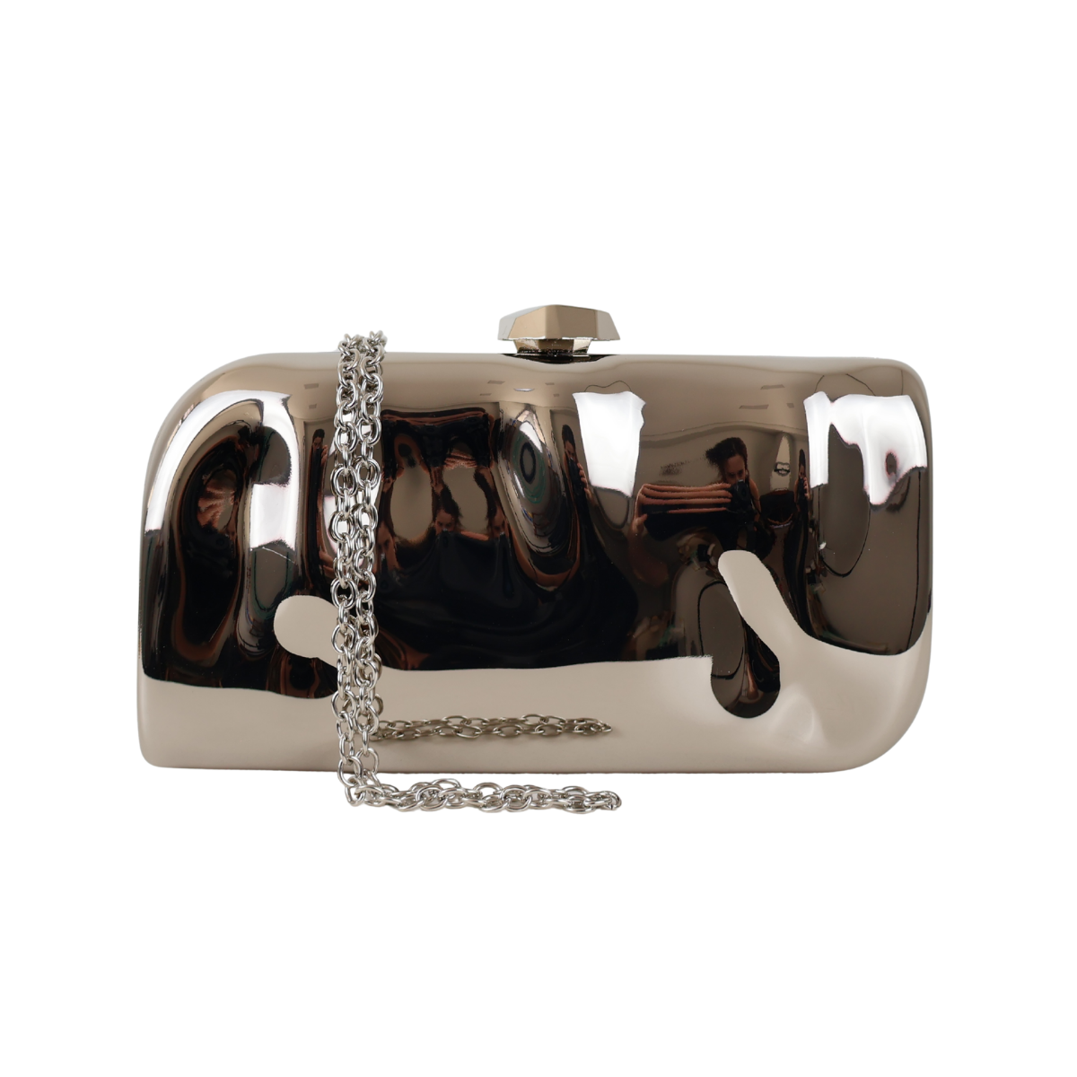 Bolsa de festa clutch de formato retangular, bordas quadradas, acabamento rígido, fecho de encaixe, interior forrado. Traz alça transversal removível.