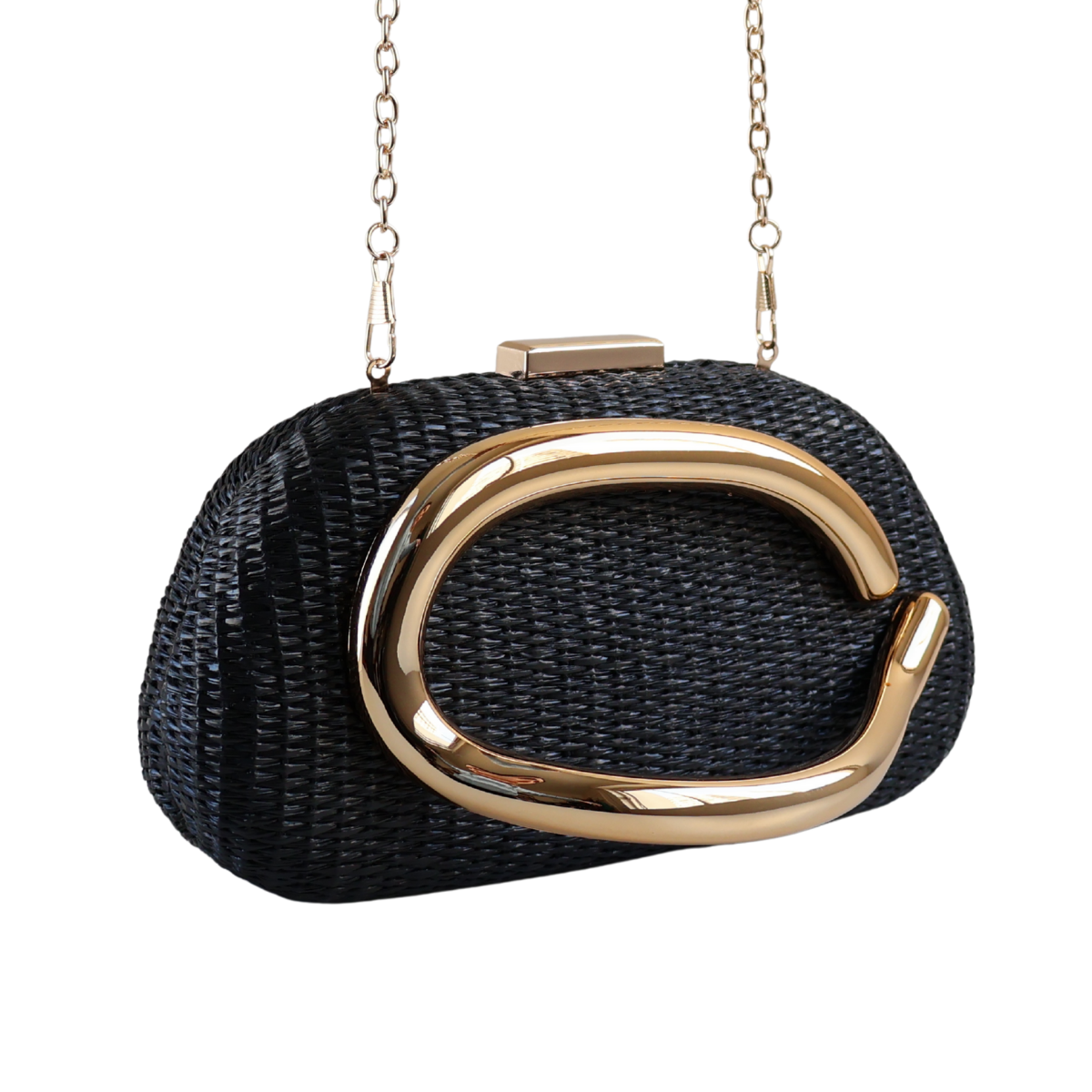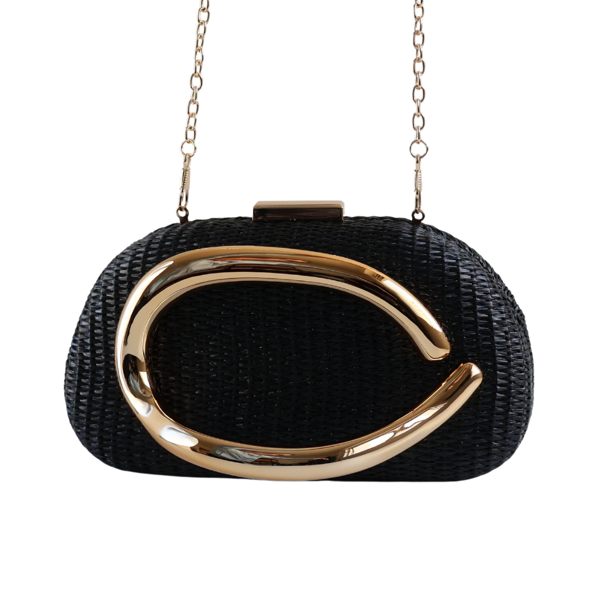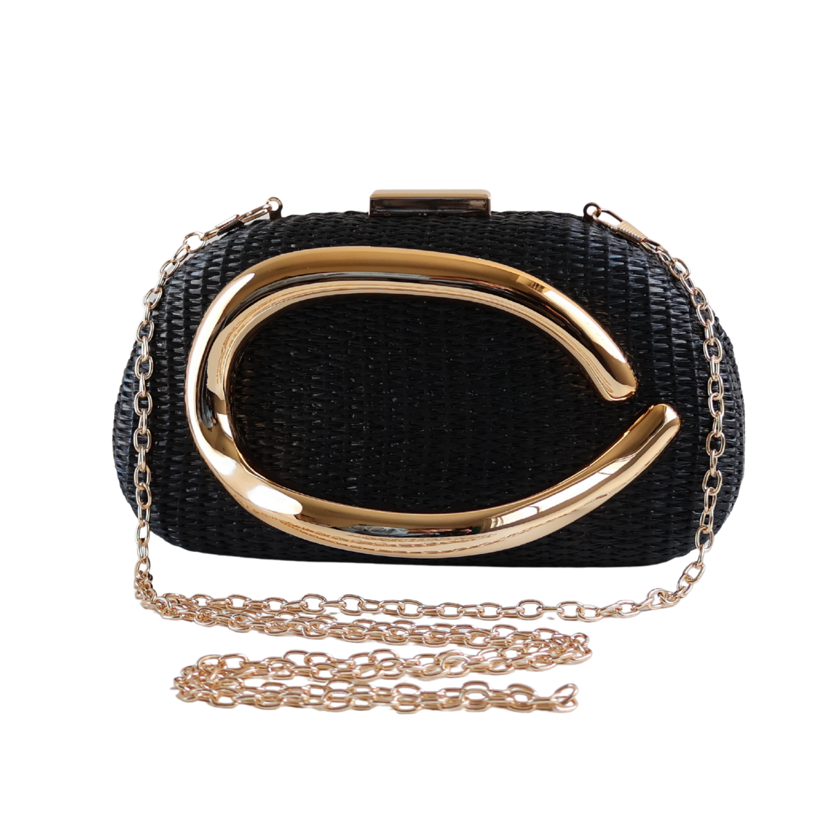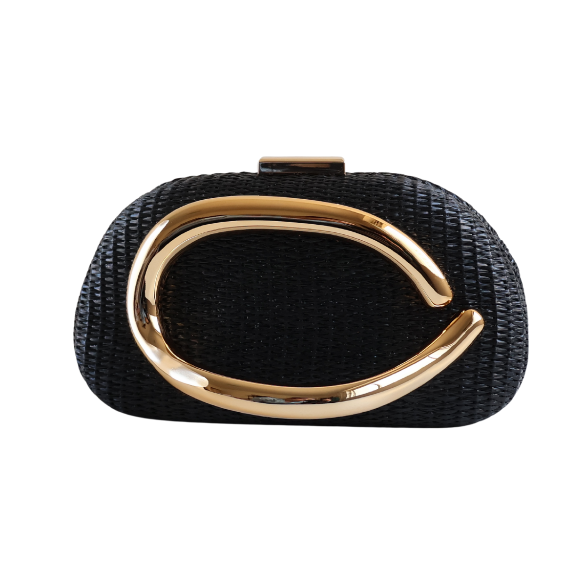 Bolsa de festa clutch de formato oval, bordas arredondadas, acabamento rígido, fecho magnético, interior forrado. Traz alça transversal removível.