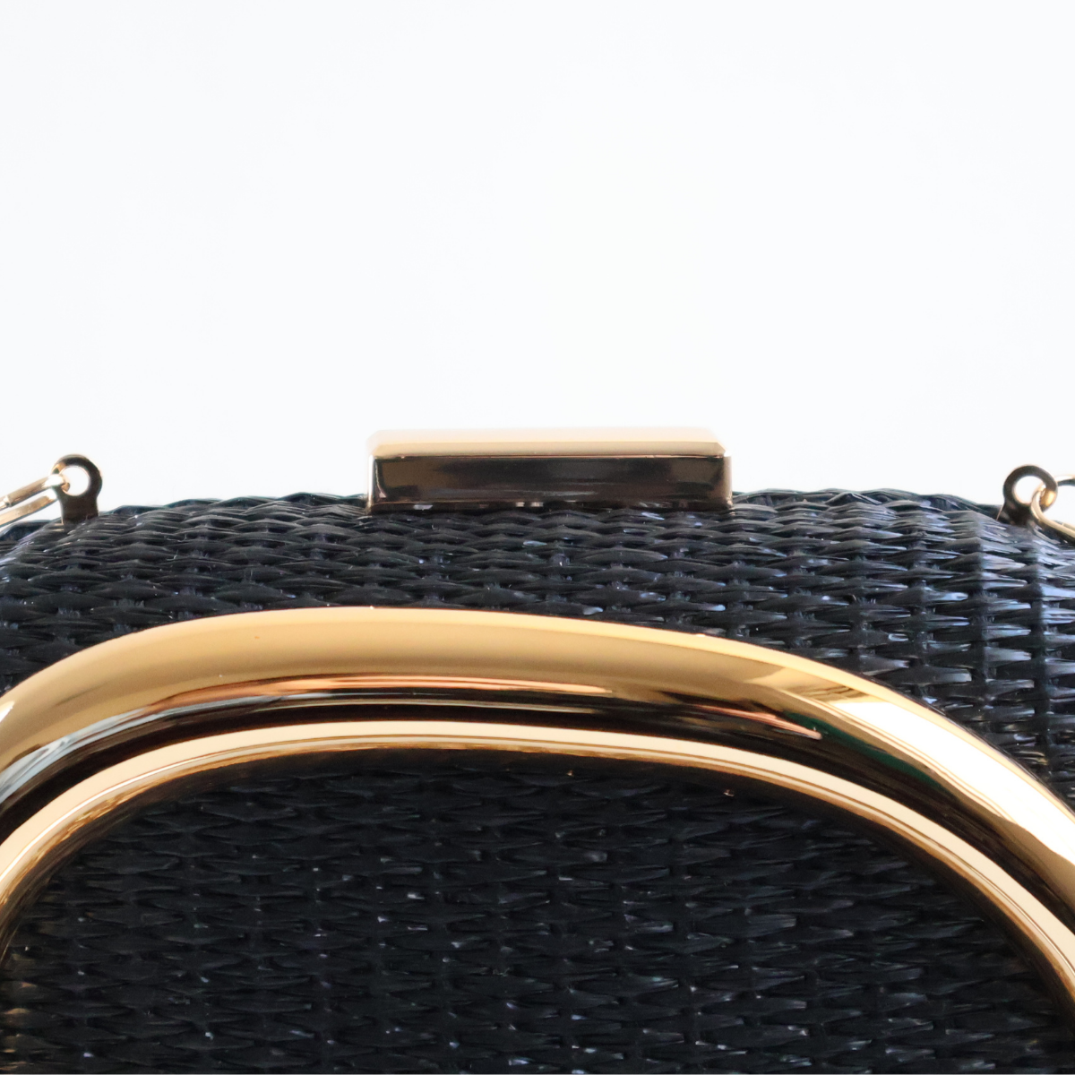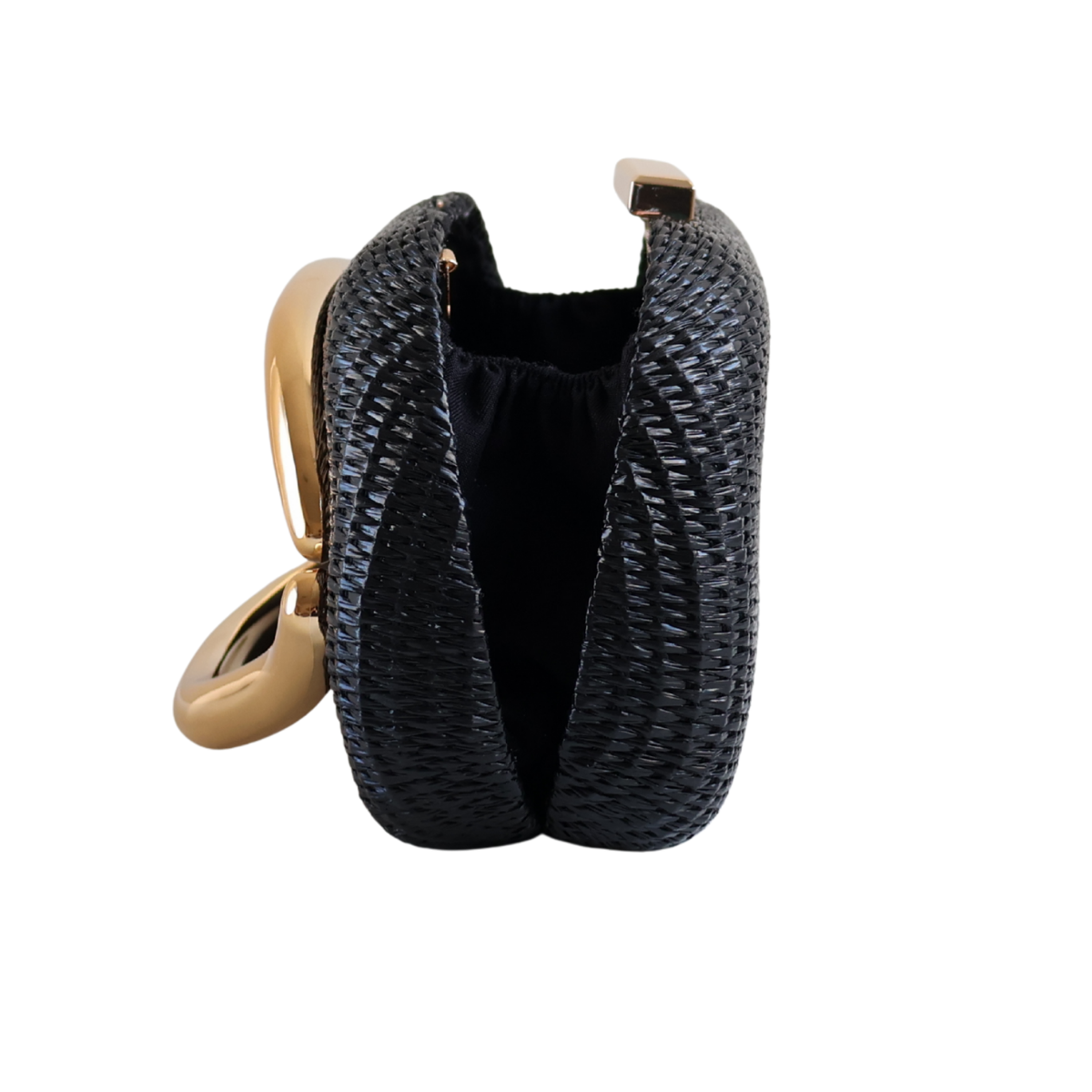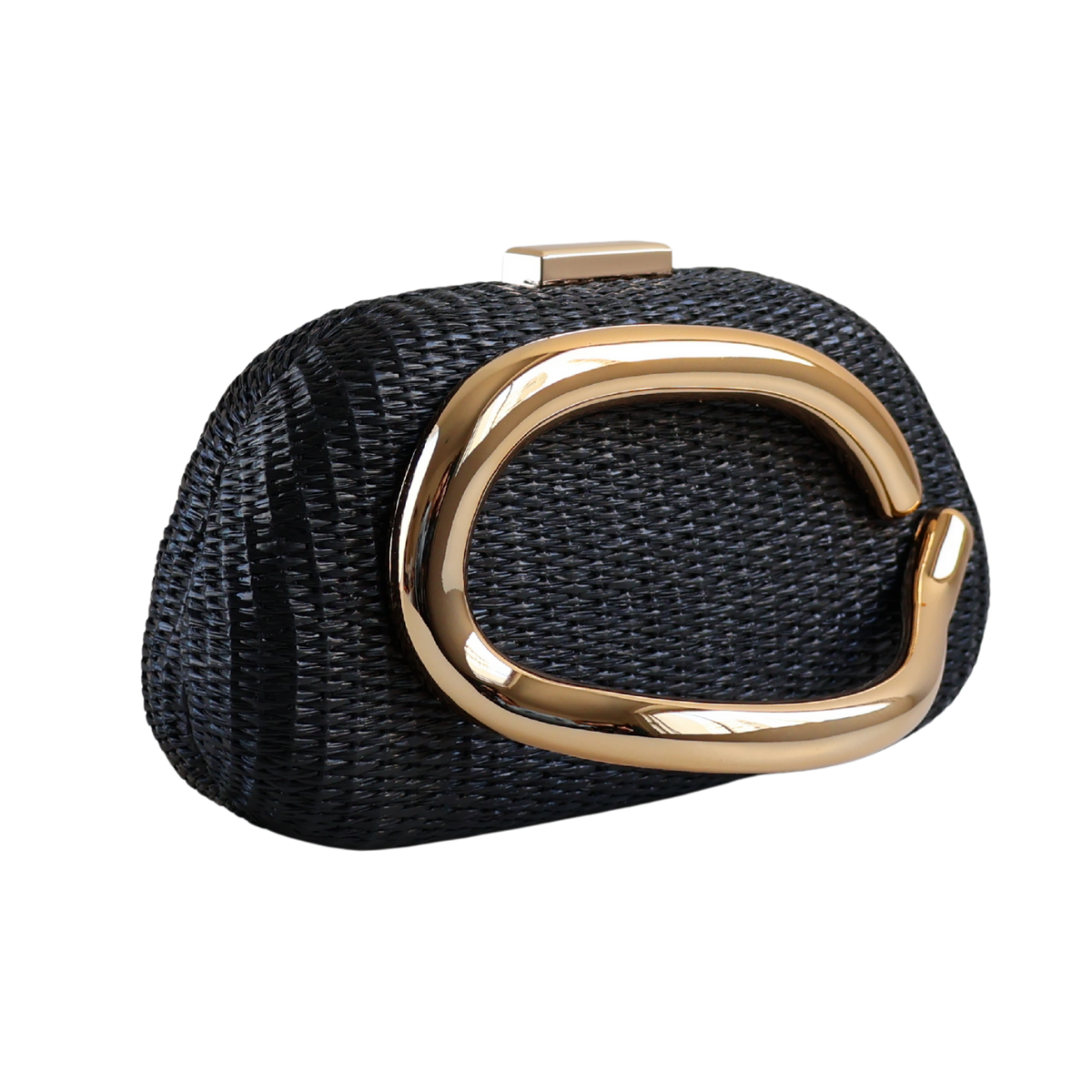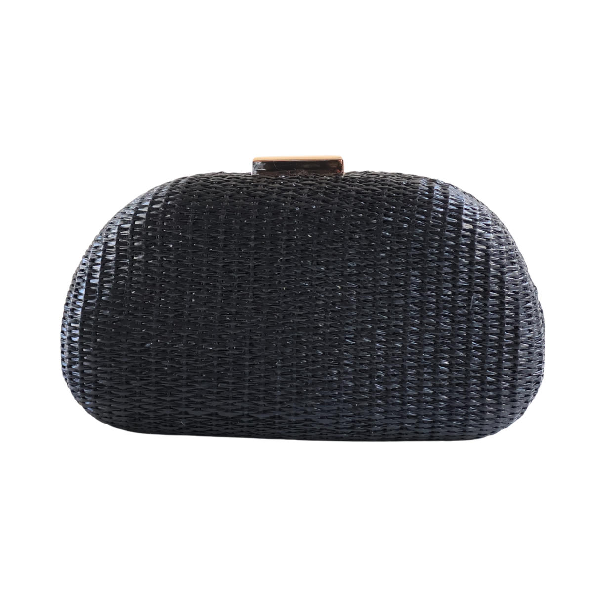 Bolsa de festa clutch de formato oval, bordas arredondadas, acabamento rígido, fecho magnético, interior forrado. Traz alça transversal removível.
