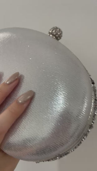 Bolsa de festa clutch de formato oval, bordas arredondadas, acabamento cravejado em pedraria / cristais brilhantes, fecho de encaixe, interior forrado no tecido cetim. Acompanha 1 alça transversal removível.