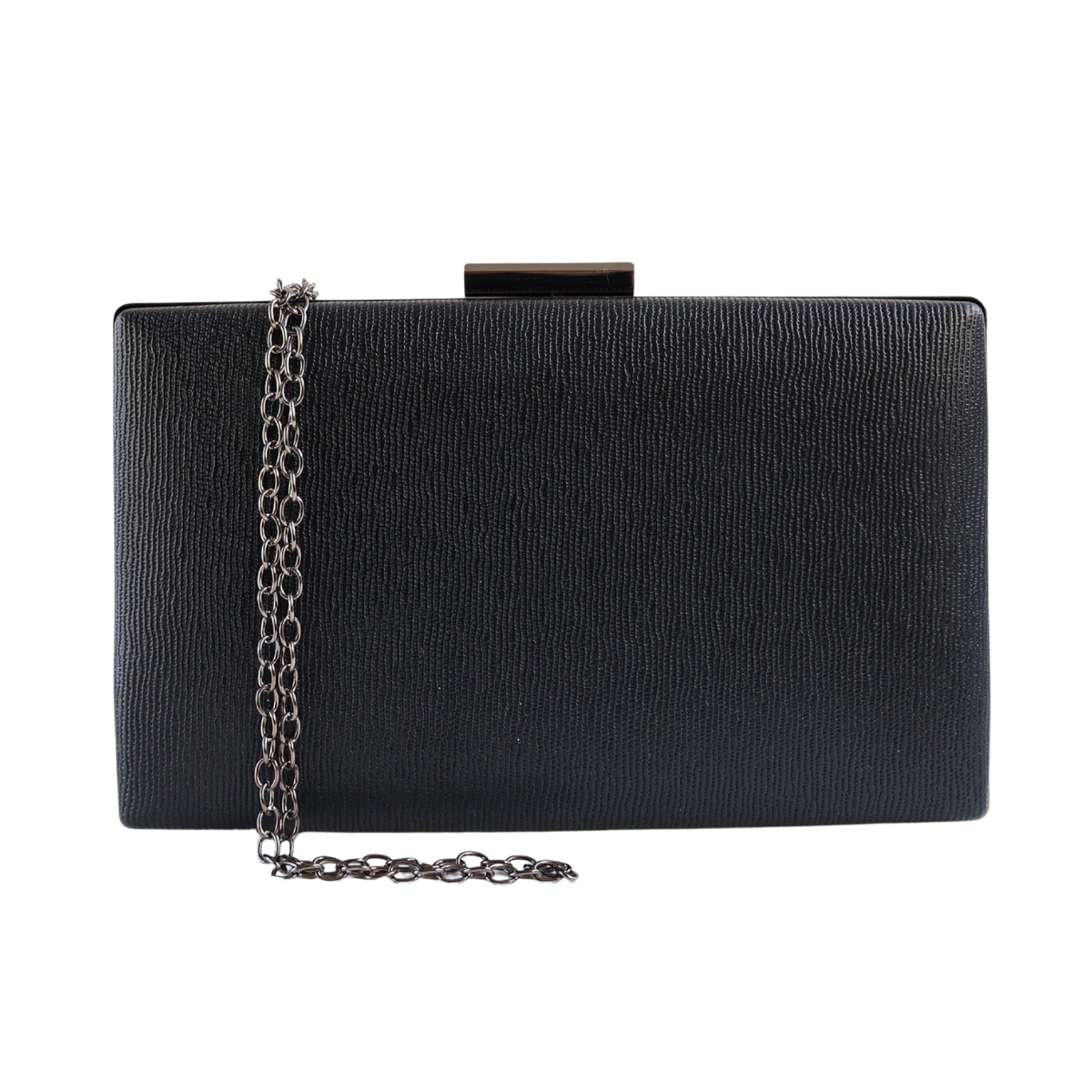 Bolsa de festa clutch retangular, bordas quadradas, acabamento liso, fecho de encaixe, interior forrado. Traz alça transversal removível.