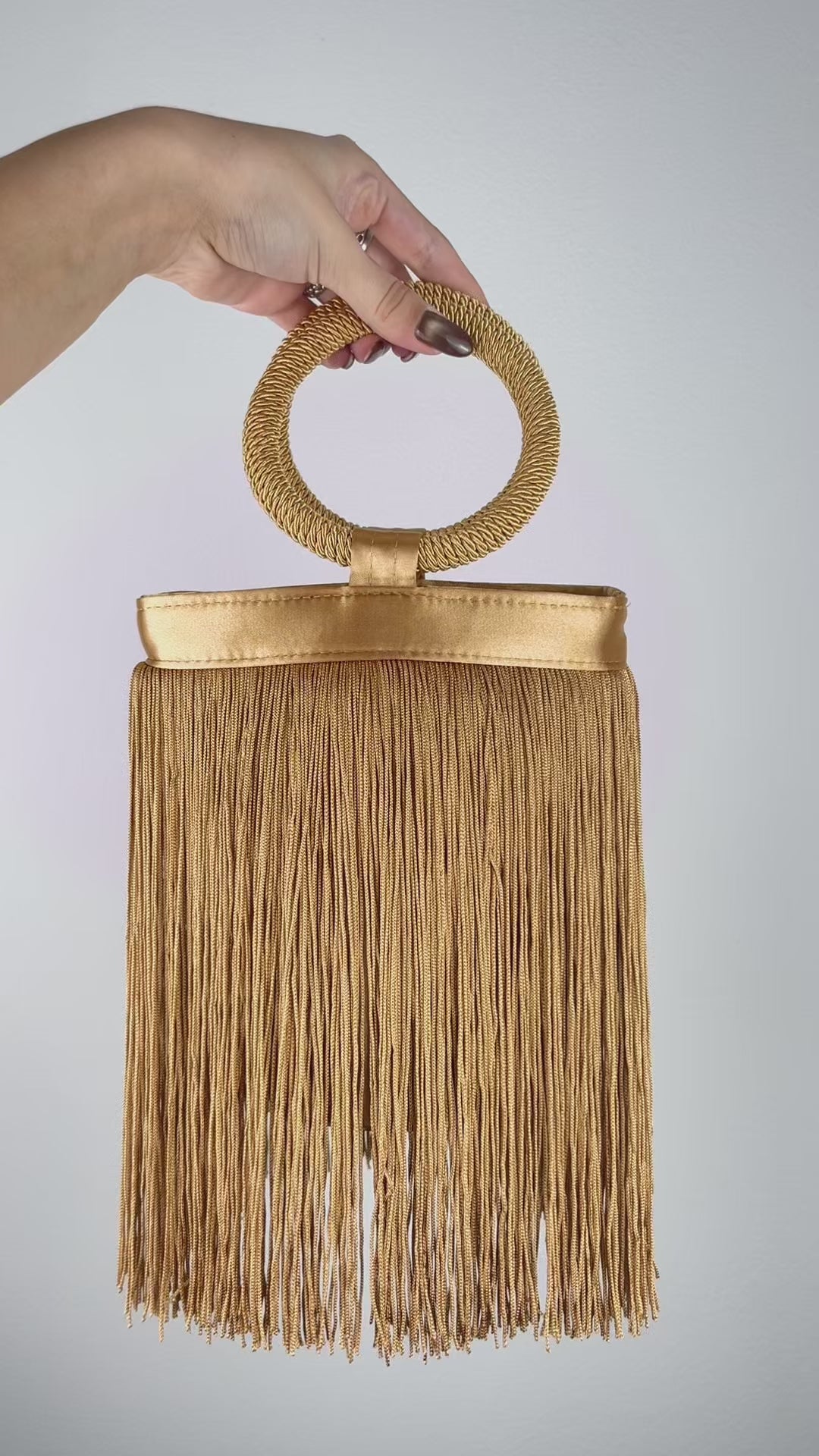 Bolsa de mão festa de formato cilíndrico, acabamento em tassel, textura macia, fecho de corda, interior forrado.