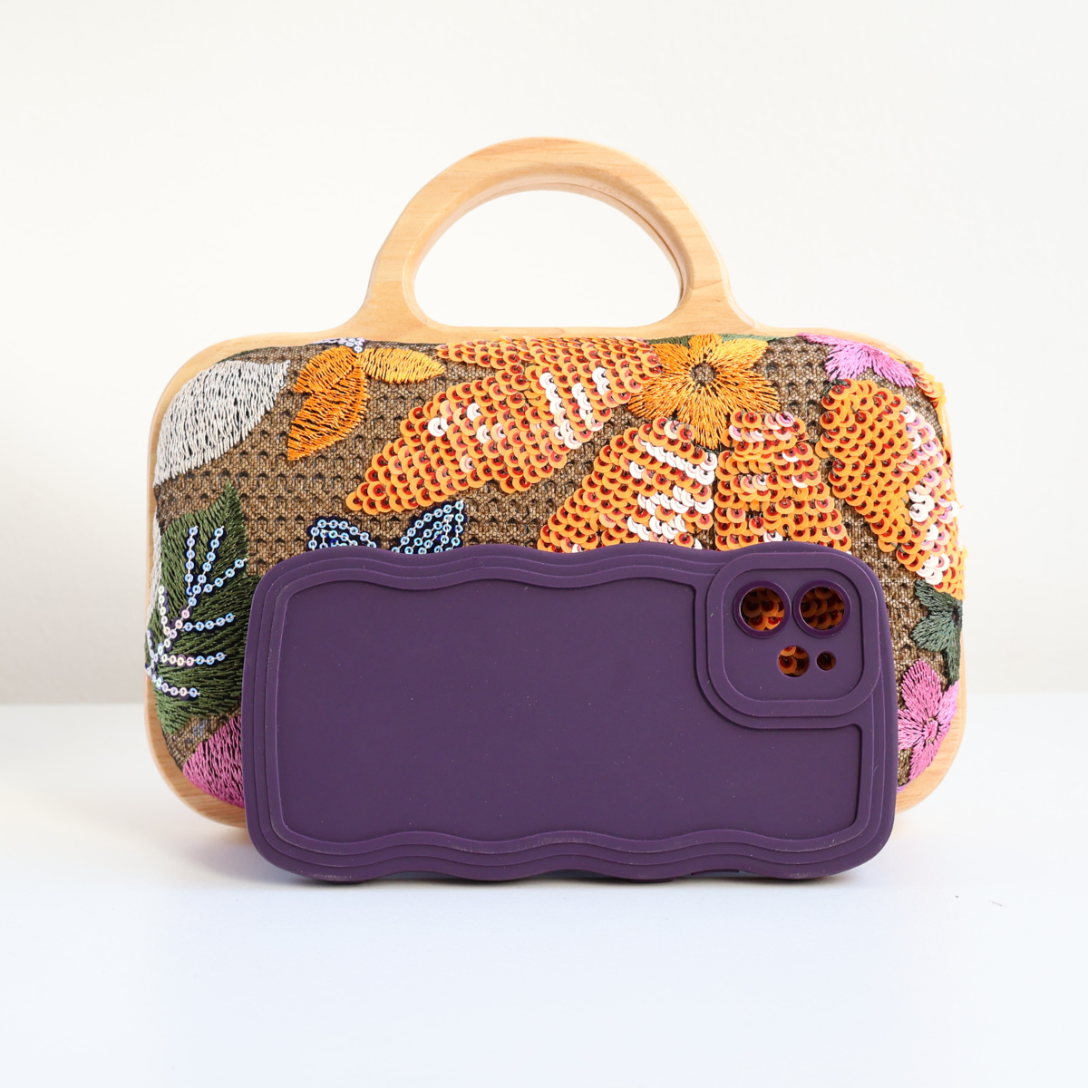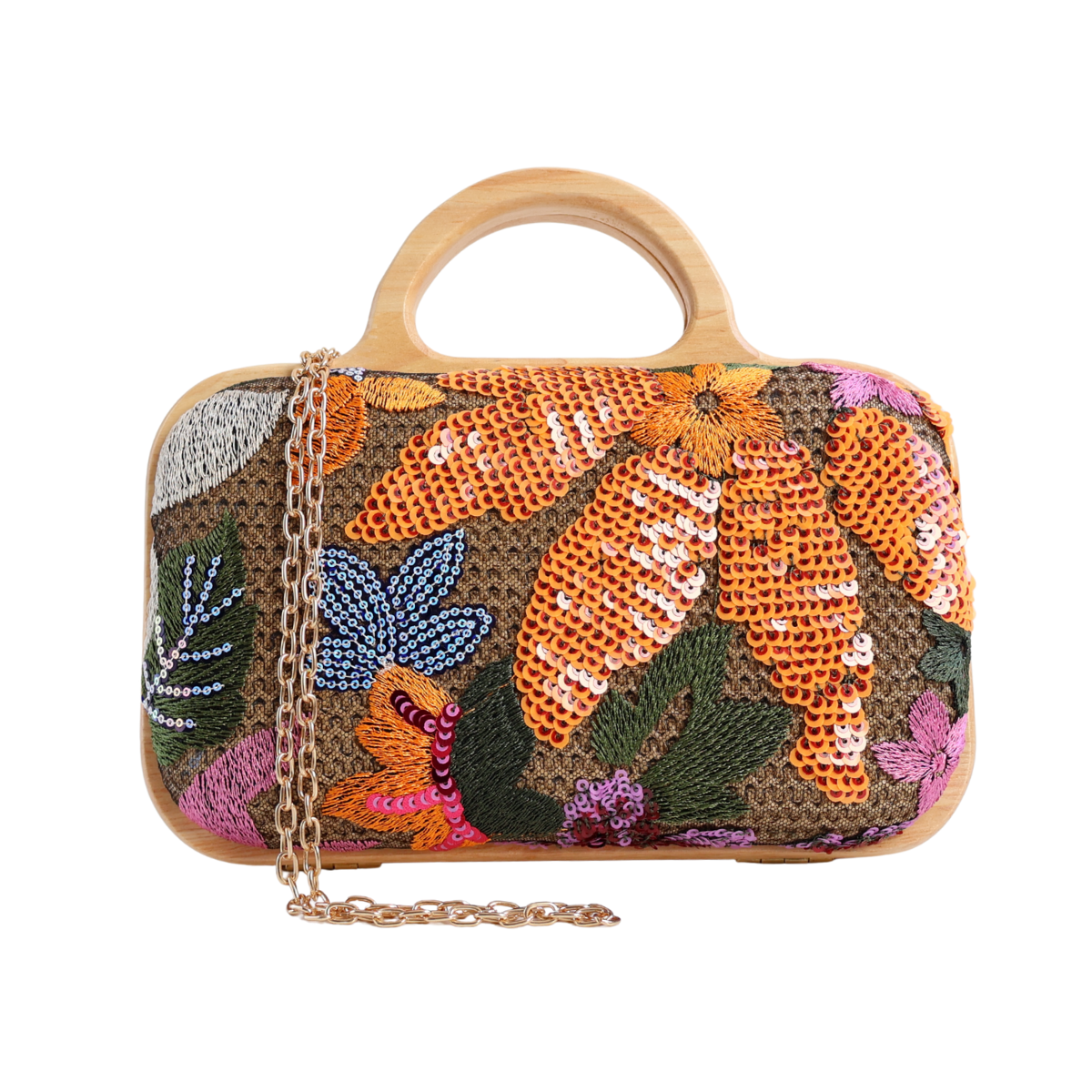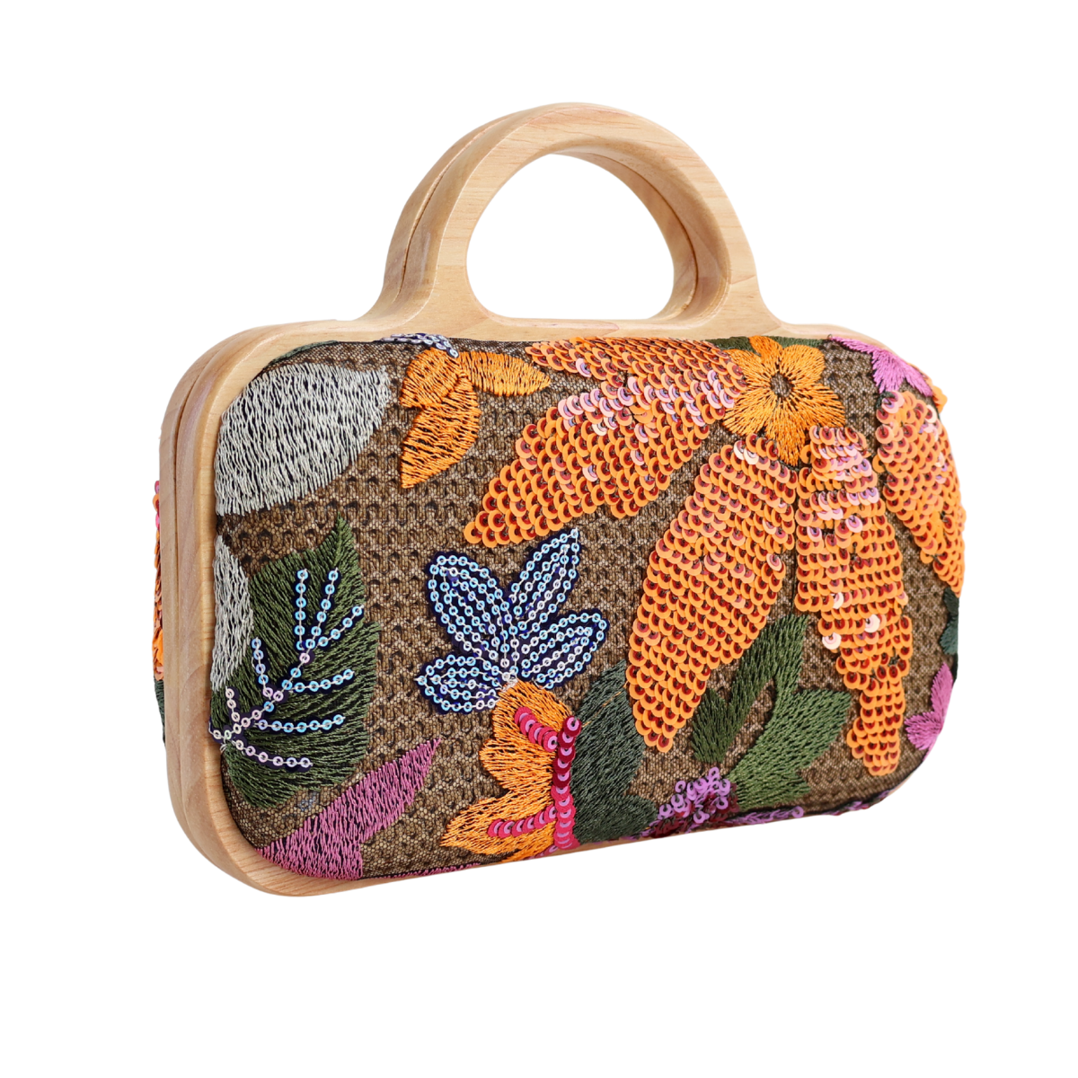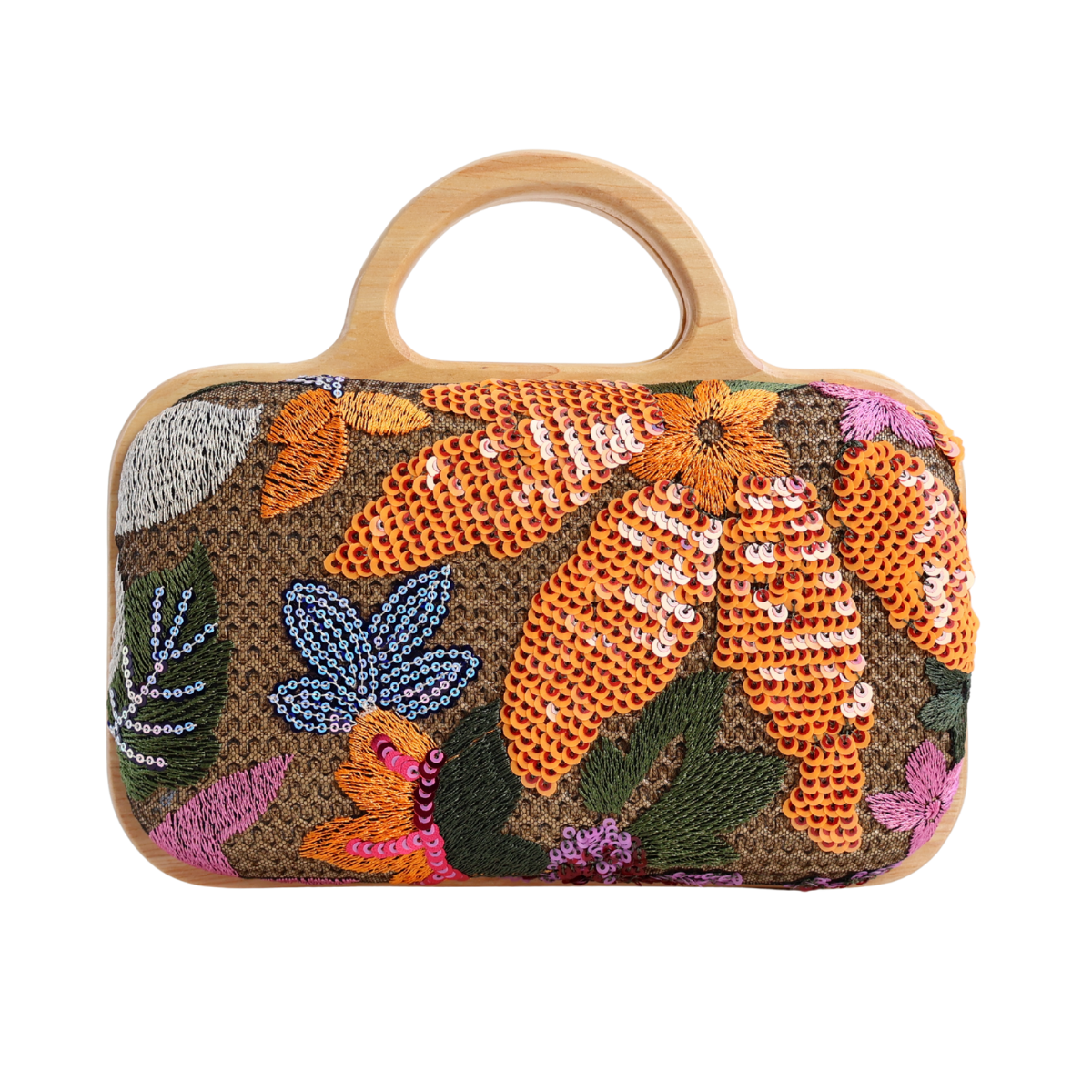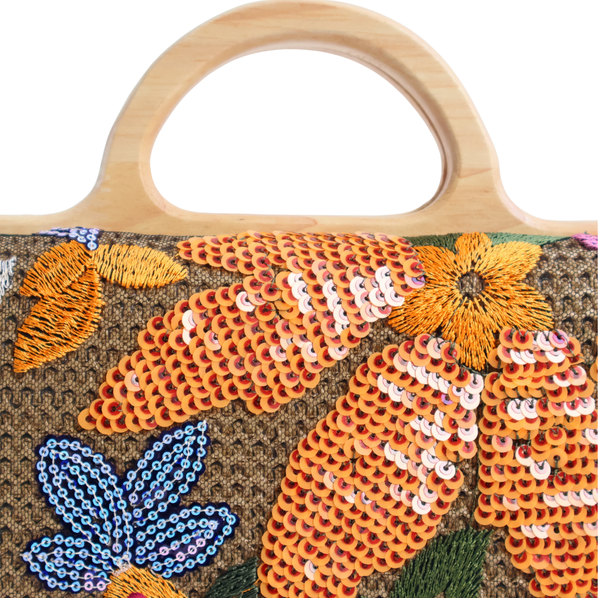 Bolsa de Mão Festa Palha Madeira Bordada Laranja
