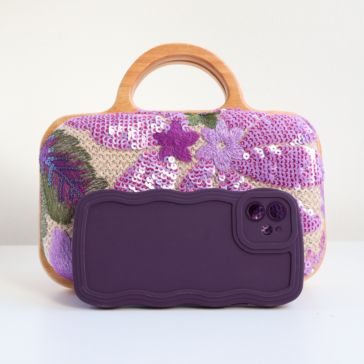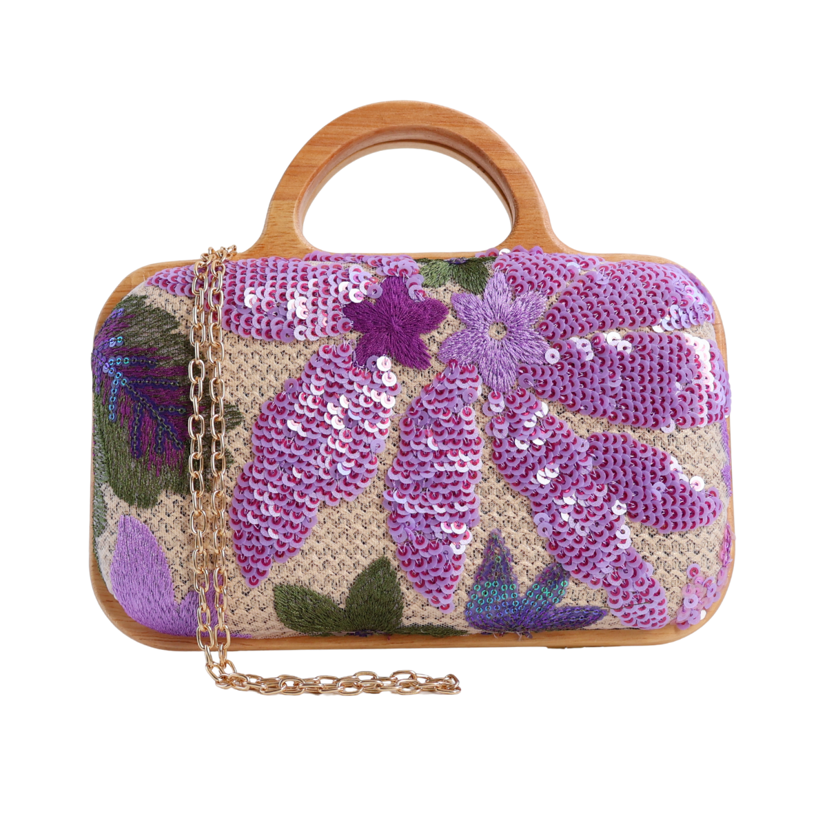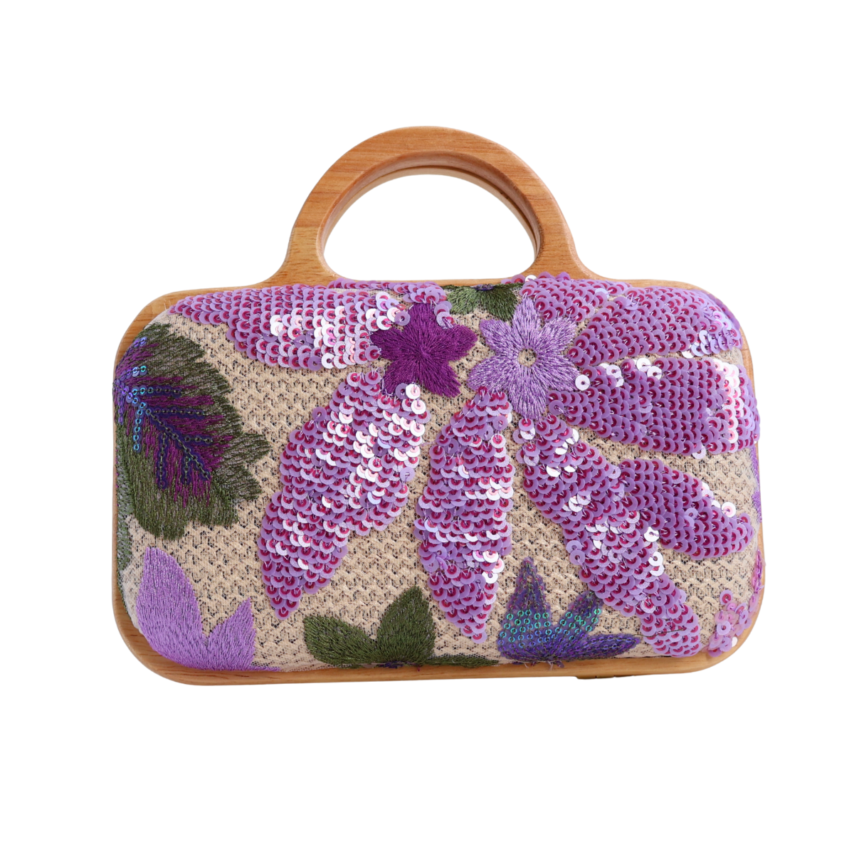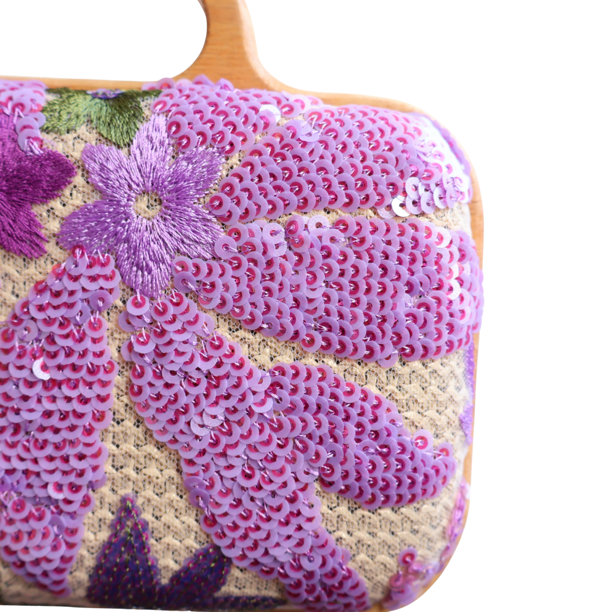 Bolsa de Mão Festa Palha Madeira Bordada Roxa