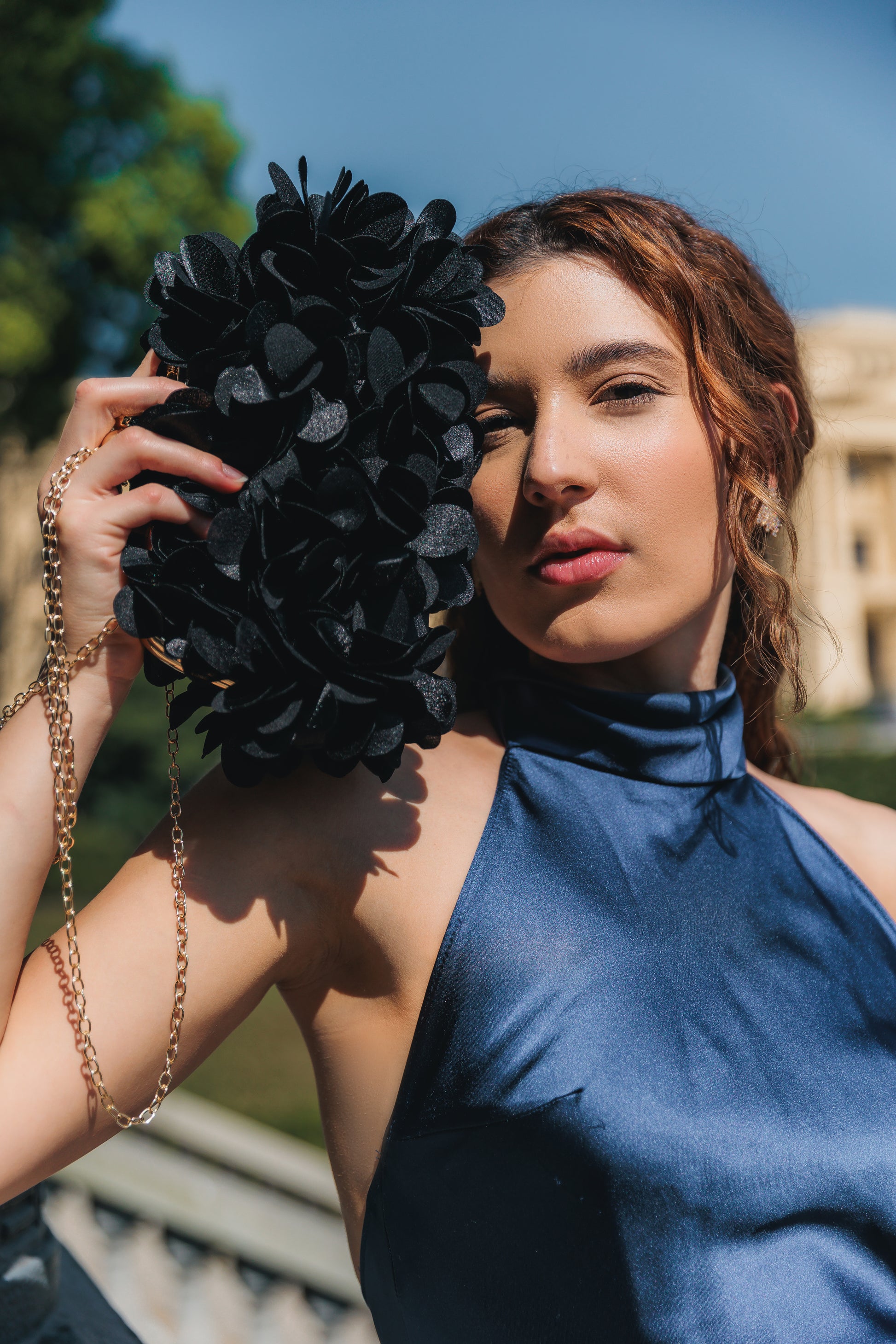 Bolsa festa clutch em flores pendentes, textura macia, acabamento costurado, fecho de encaixe, interior forrado. Traz alça transversal removível.