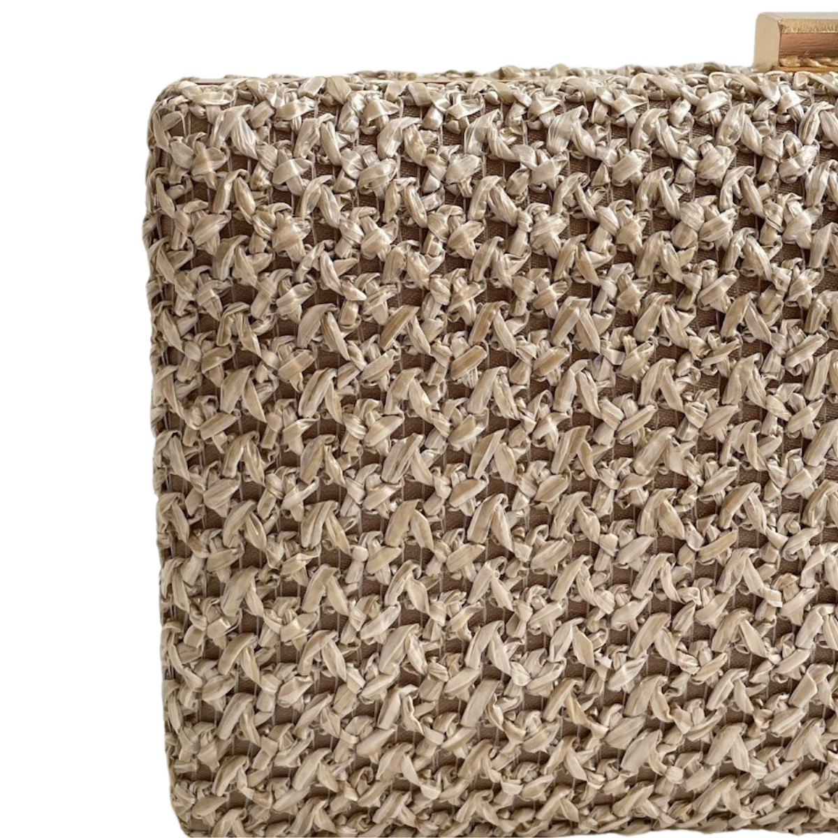 Bolsa de festa clutch de formato retangular, bordas quadradas, acabamento em palha sintética, fecho de encaixe, interior forrado. Traz alça transversal removível.