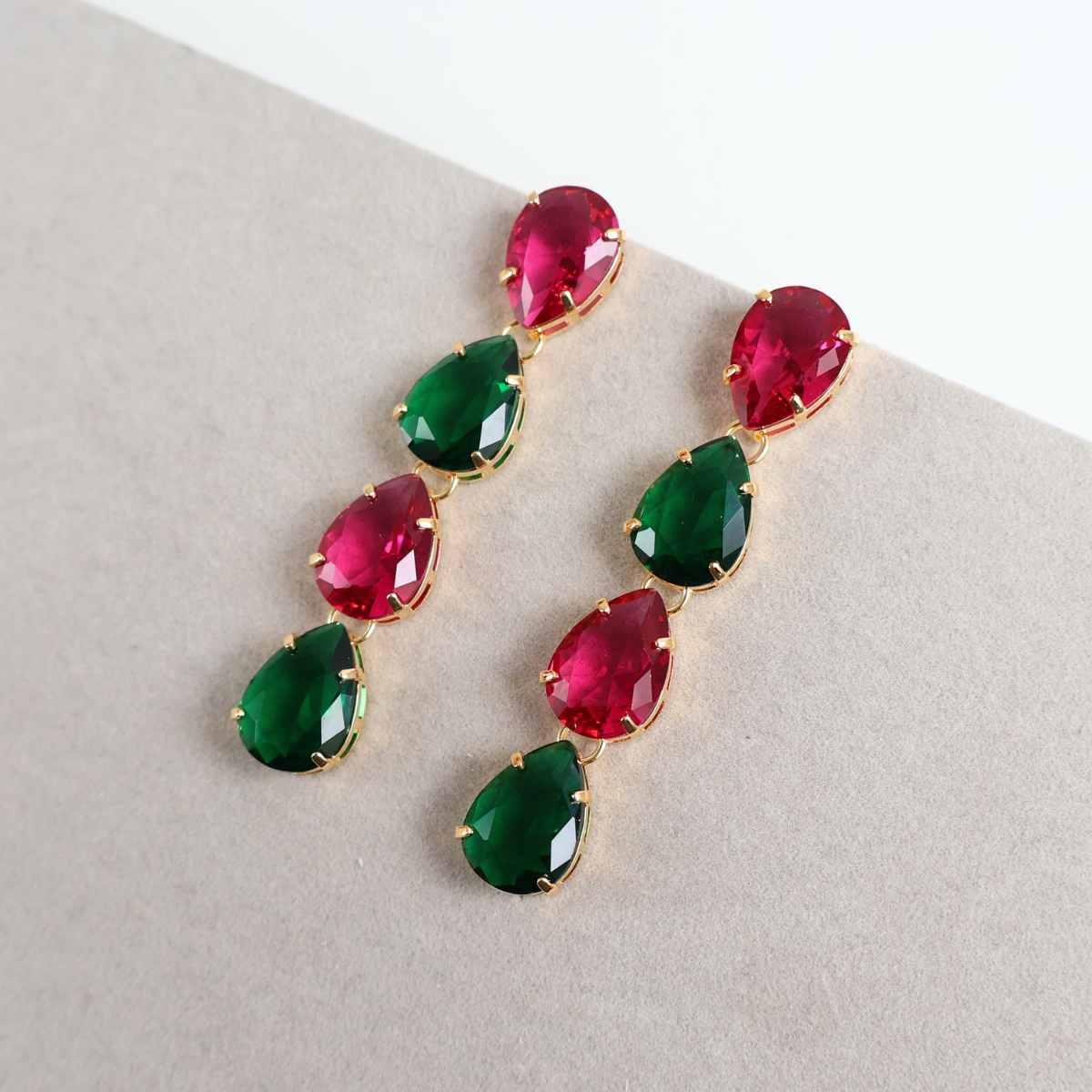 Brinco Dourado e Cristal Verde e Rosa - Semijoia