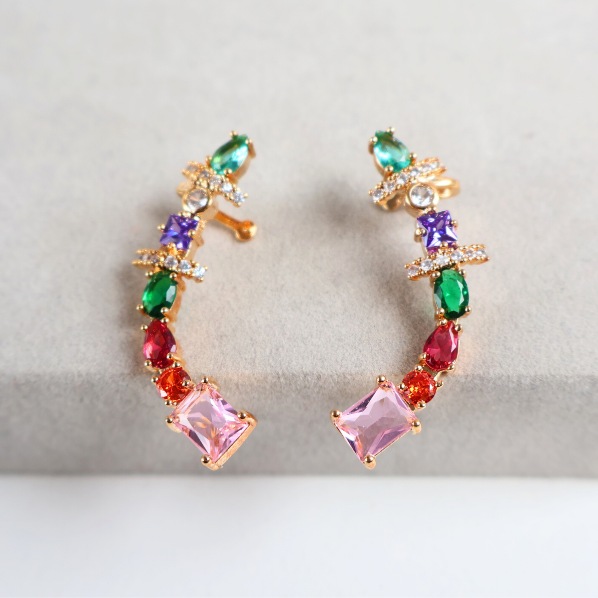 Brinco Earcuff Dourado e Cristal Colorido - Semijoia