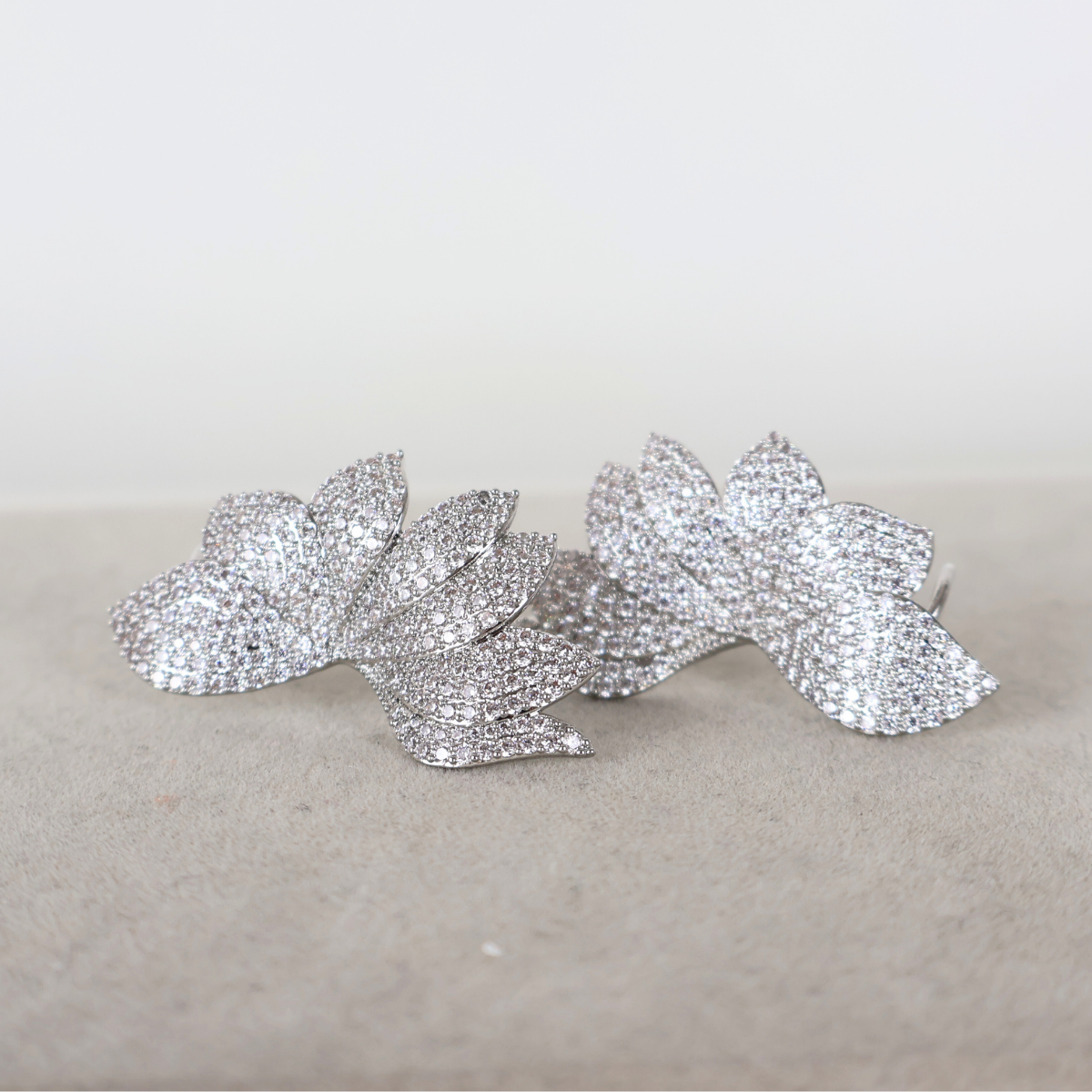 A peça é banhada com ródio branco e finalizada com verniz que proporciona um acabamento levemente mate, destacando o cristal. Ideal para eventos como casamentos e formaturas.