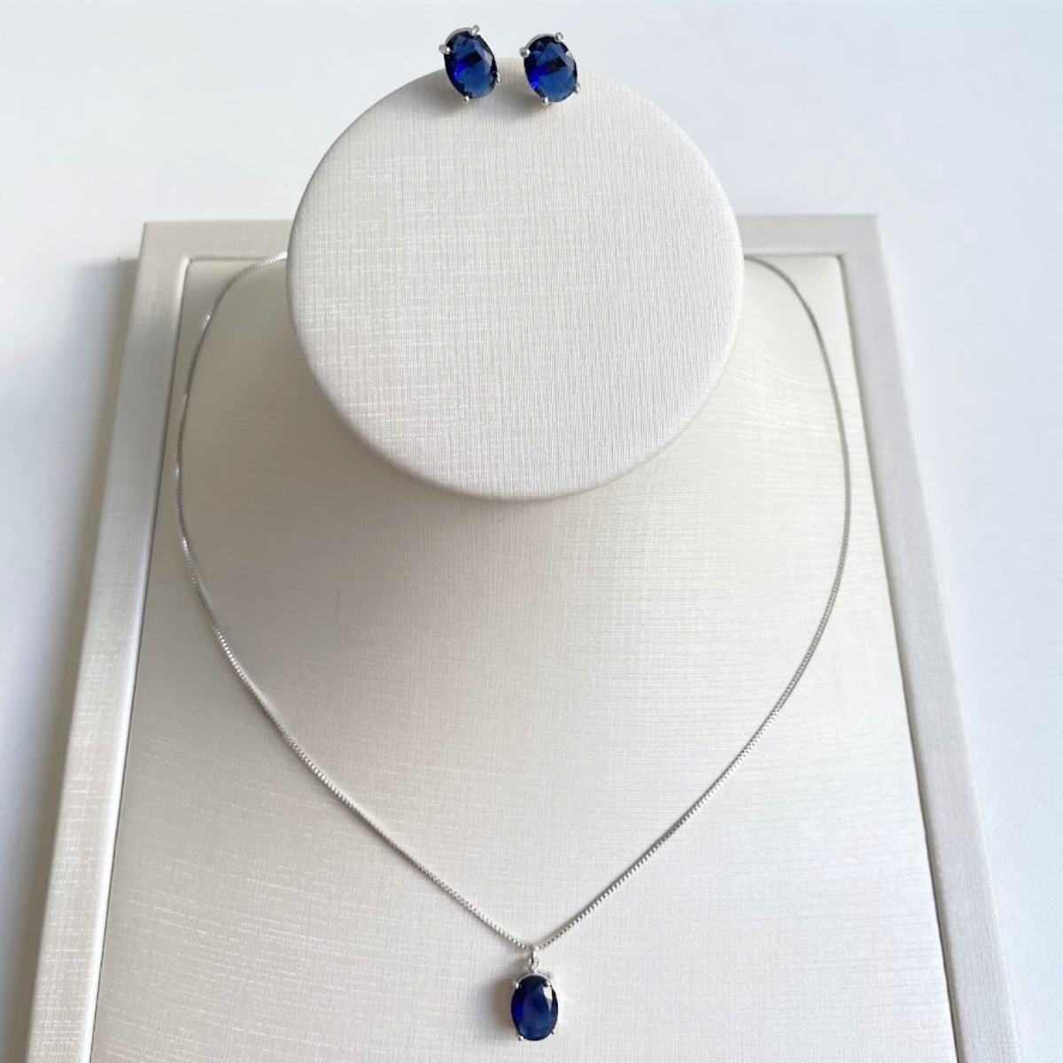 Kit Brinco e Colar - Ródio Branco - Cristal Azul - Semijoia