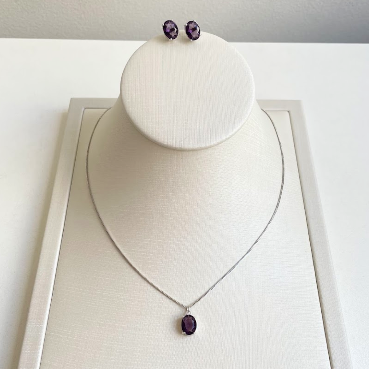 Kit Brinco e Colar - Ródio Branco - Cristal Roxo - Semijoia