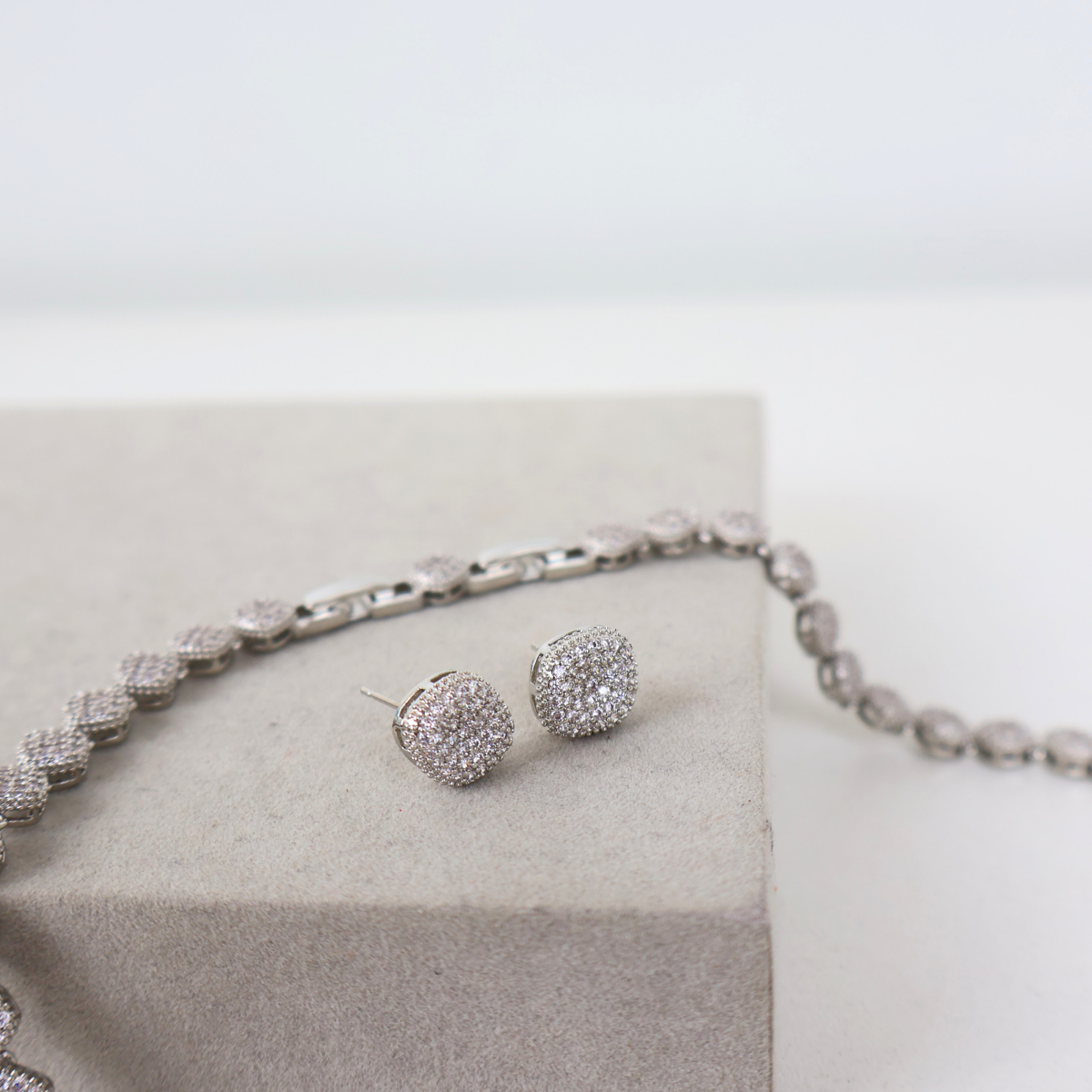 A peça é banhada com ródio branco (3 milésimos) e finalizada com verniz que proporciona um acabamento levemente mate, destacando o cristal. Ideal para eventos como casamentos e formaturas.