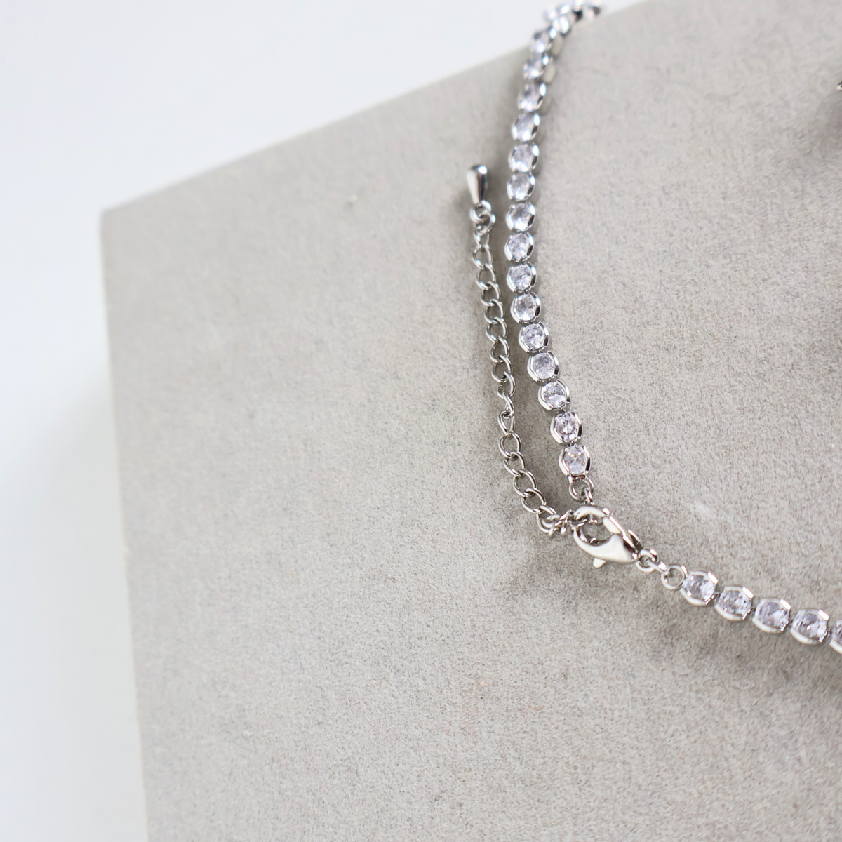 A peça é banhada com ródio branco (3 milésimos) e finalizada com verniz que proporciona um acabamento levemente mate, destacando o cristal. Ideal para eventos como casamentos e formaturas.